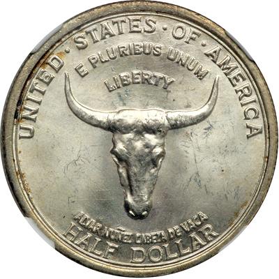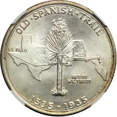 1935 Spanish Trail Half Dollar. NGC graded MS-65. A popular commemorative half dollar. Frosty gem. The obverse has a punning head of a cow in honor of Alvar Nunez Cabeza de Vaca (Cabeza de Vaca being Spanish for "head of a cow"). Nunez explored the Old Spanish Trail region in 1528. The reverse delineates (none to accurately) his path from Florida to El Paso, Texas along with a yucca tree at center, a common regional plant (PCGS # 9376) .