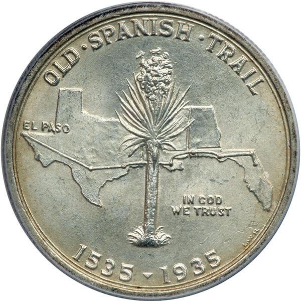 1935 Spanish Trail Half Dollar. PCGS graded MS-66. Well struck with beautiful even light toning. It is always a treat to be able to offer for sale an extremely lustrous Gem that has superlative fields and devices. Stored in a Raymond folder for over 60 years. First time ever graded (PCGS # 9376) .
