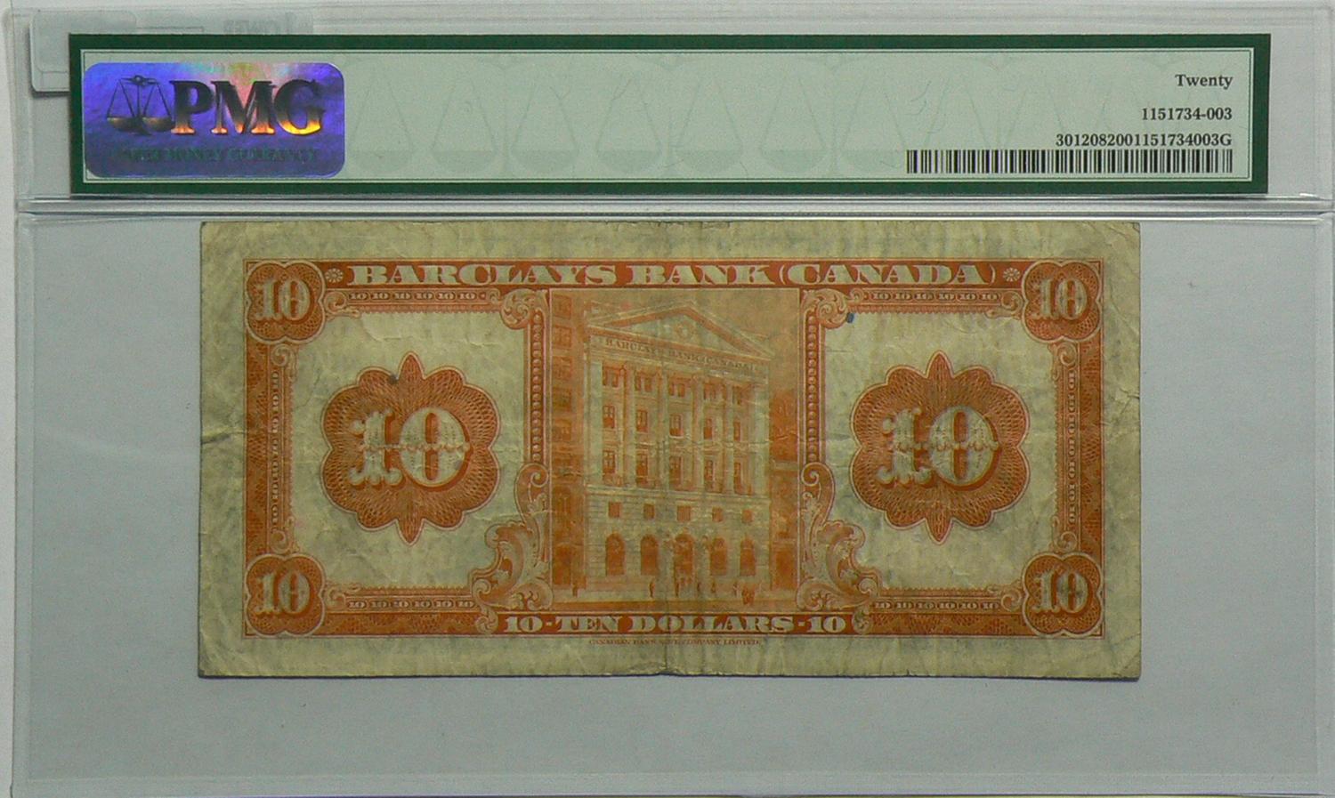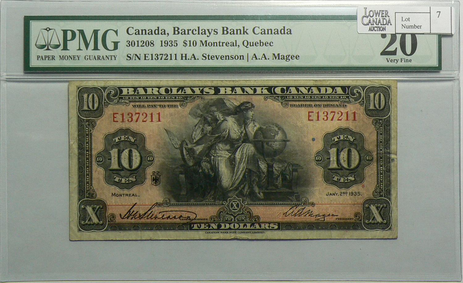 1935 Ten Dollars Barclays Bank of Canada, 30-12-08, PMG VF-20, Stevenson Magee, serial E137211.