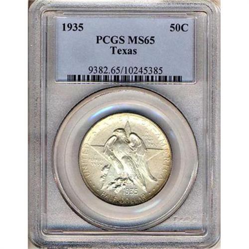 <b>1935 Texas Half Dollar. PCGS graded MS65.</b> Lightly toned. A frosty gem of the more common issue from 1935. Mintage started off with a fair number coined but then declined each year until the lowest figure was reached in 1938 <b>(PCGS # 9382)</b> <i>