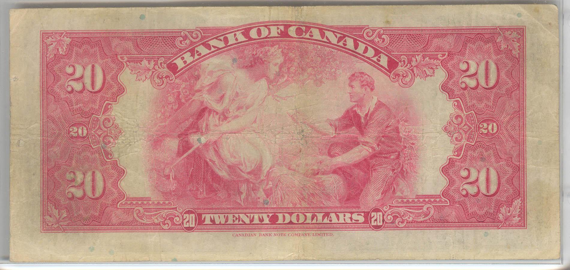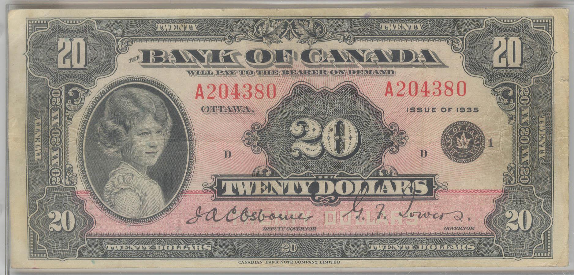 1935 Twenty Dollars English, BC-9a, CCGS F-18; Small Seal, Osborne Towers, Letter D, Small Seal, serial A204380.