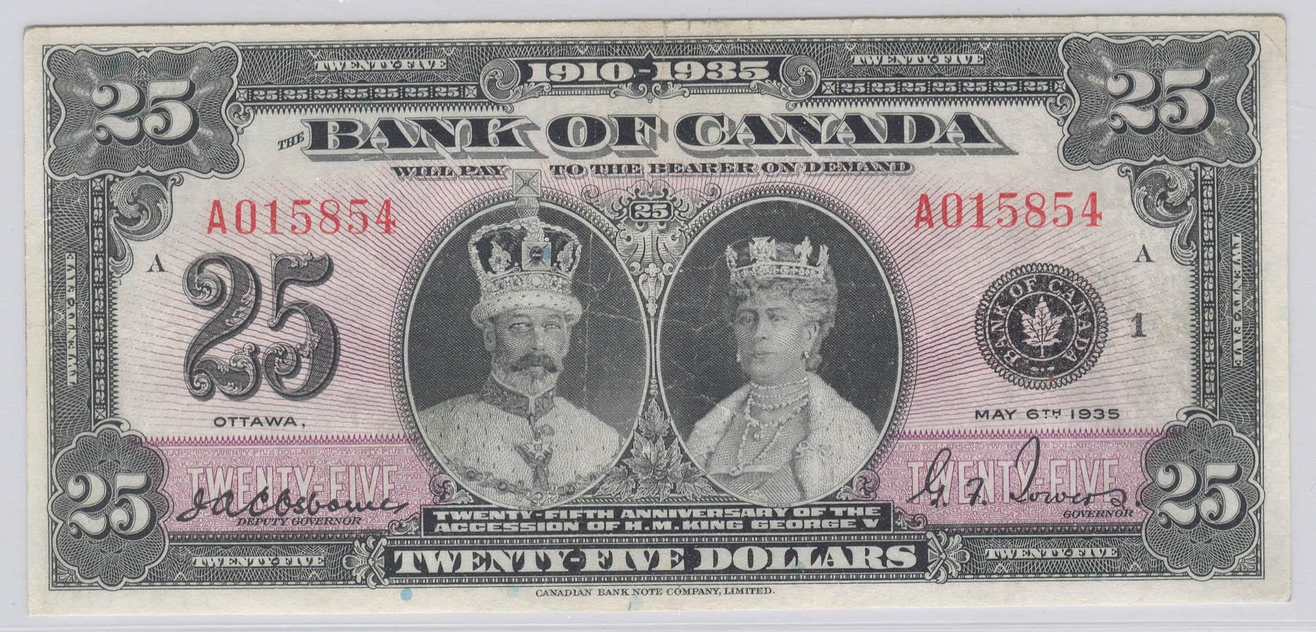 1935 Twenty Five Dollars English, BC-11, BCS F-15, Osborne Towers, Letter A, serial A015854.