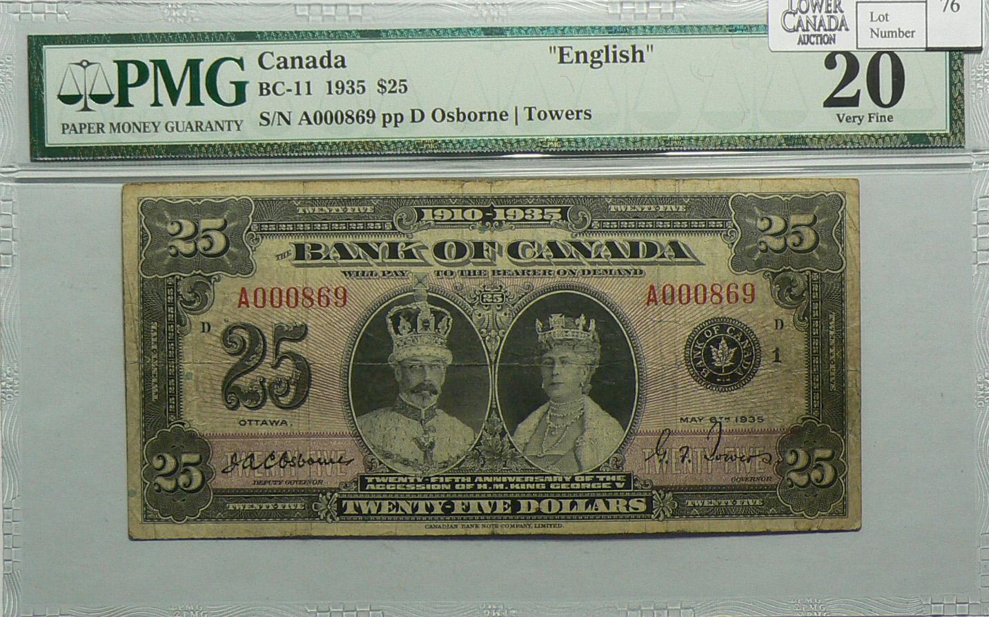 1935 Twenty-Five Dollars English, BC-11, PMG VF-20, Osborne Towers, Letter D, serial A000869.