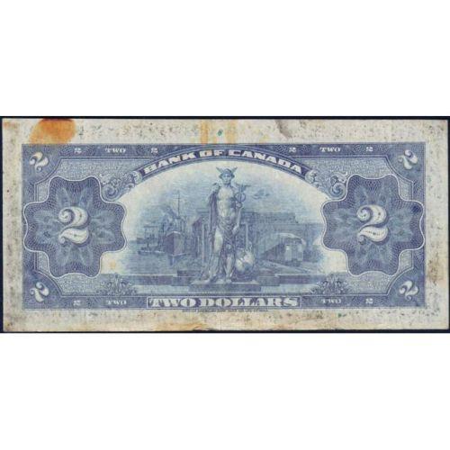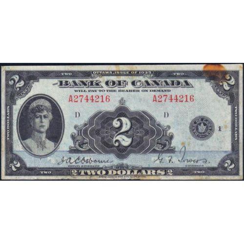1935 Two Dollars, English, BC-3 Serial Number A2744216 D PMG Choice Fine 15. Some staining on both sides and soiling on the back