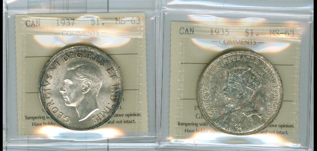 1935 and 1937 $1 MS63. Lot of 2 ICCSSilver dollars lightly toned.