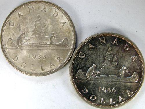 Canada Silver Dollar 1935 and 1946. Two lightly toned pieces, both Choice AU to Uncirculated