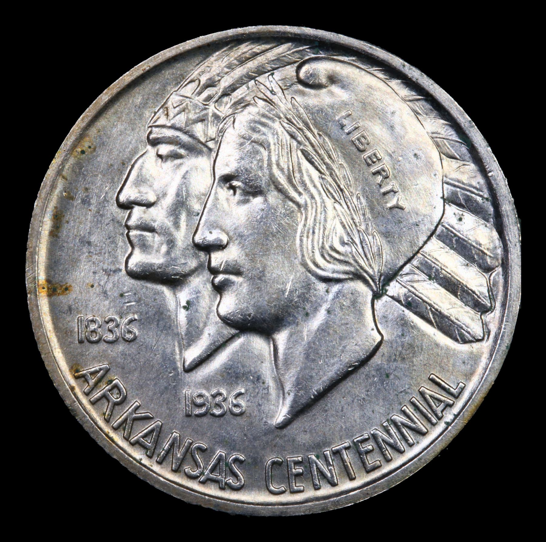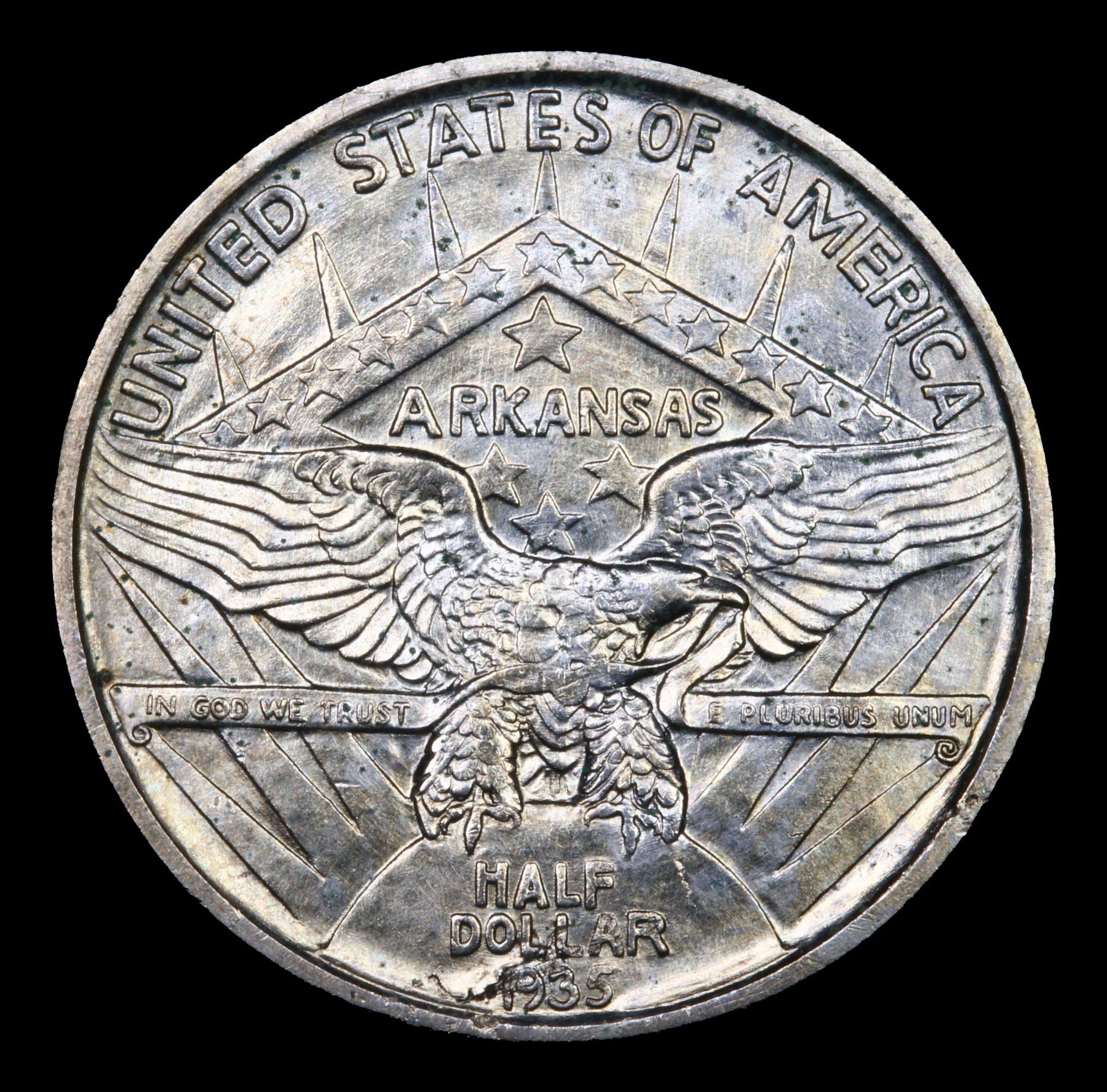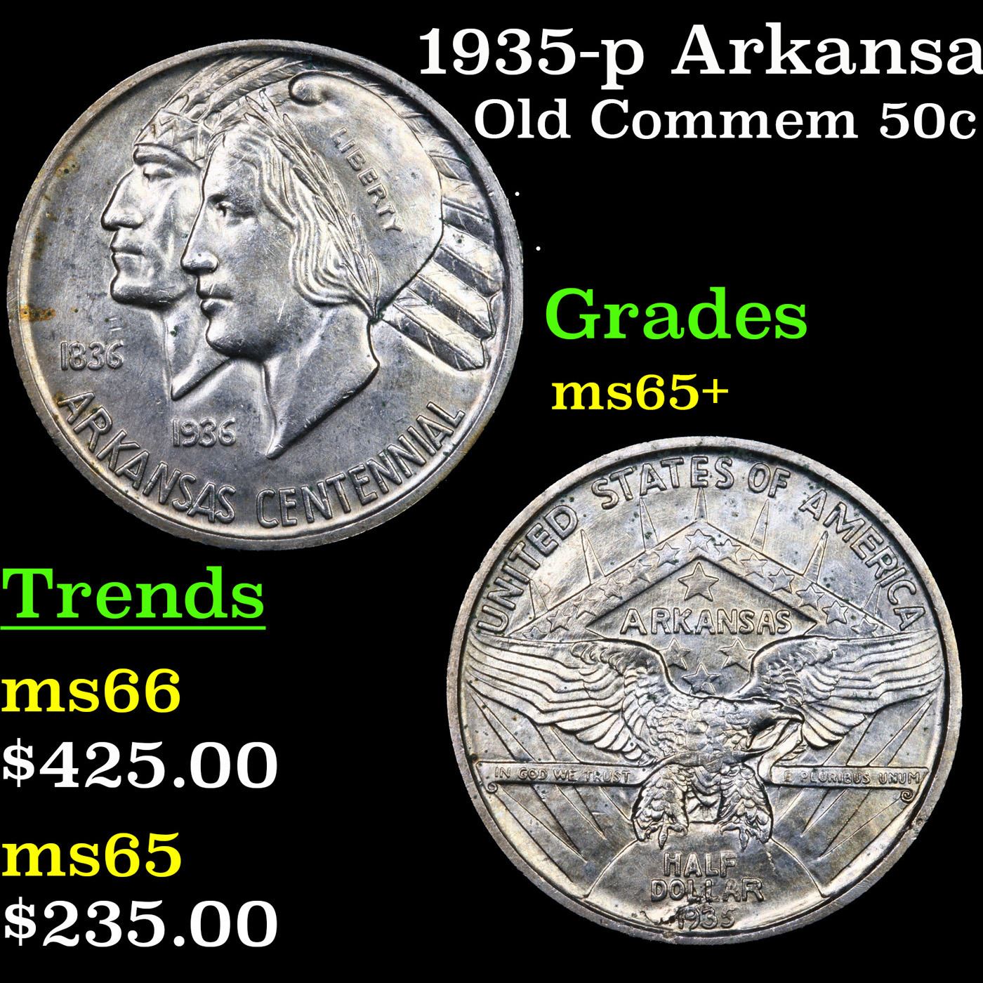 1935-p Arkansas Old Commem Half Dollar 50c Grades GEM+ Unc. Commemorative coins were authorized to celebrate the 100th anniversary of the admission of Arkansas into the Union. The Arkansas Centennial Half Dollars ended up being issued during five separate years, across three different mints. The coins became controversial due to the stream of variations created specifically to market to collectors, as well as the escalating issue prices as mintage for later issues became smaller.The obverse design features the head of Liberty and a Native American in headdress. Although this is now considered to be the obverse of the coin, there was initially some confusion and US Mint records and some references refer to this side as the reverse. In 1936, a new design was issued for this side of the coin, featuring a Senator who was living at the time of issue. The 1936 Robinson-Arkansas Half Dollar is considered a separate issue by most collectors.The reverse of the coin features the image of an eagle with wings spread, perched on the rising sun with rays emanating upwards. In the background a geometrical shape appears with the word “Arkansas” at center, amidst an arrangement of stars. Both the obverse and reverse design designed by Edward Everett Burr, following models prepared by Emily Bates.At the onset, the Arkansas Half Dollar was struck in a modest quantity of 13,012 pieces at the Philadelphia Mint with an additional 5,505 from Denver and 5,506 from San Francisco. The Philadelphia issues were sold at an issue price of $1 each, while the mint marked coins were purchased in a bulk transaction by a coin dealer and subsequently sold for $2.75 each. This initial situation was a taste of things to come.In the following year, coins from three different mints were initially offered for $1 each, but the price was quickly raised to $1.50 per coin, and eventually sold as sets of three coins for $6.75. The following year three coin sets were sold at $8.75, which was eventually raised to $10. This would also be the price of the 1939 sets.