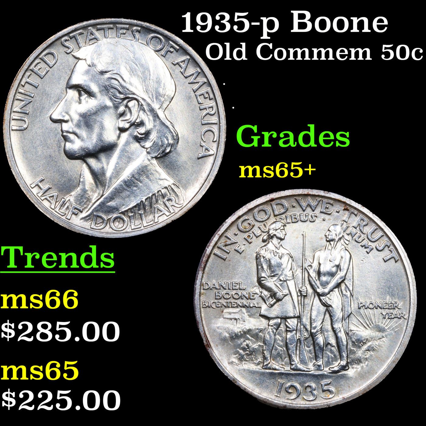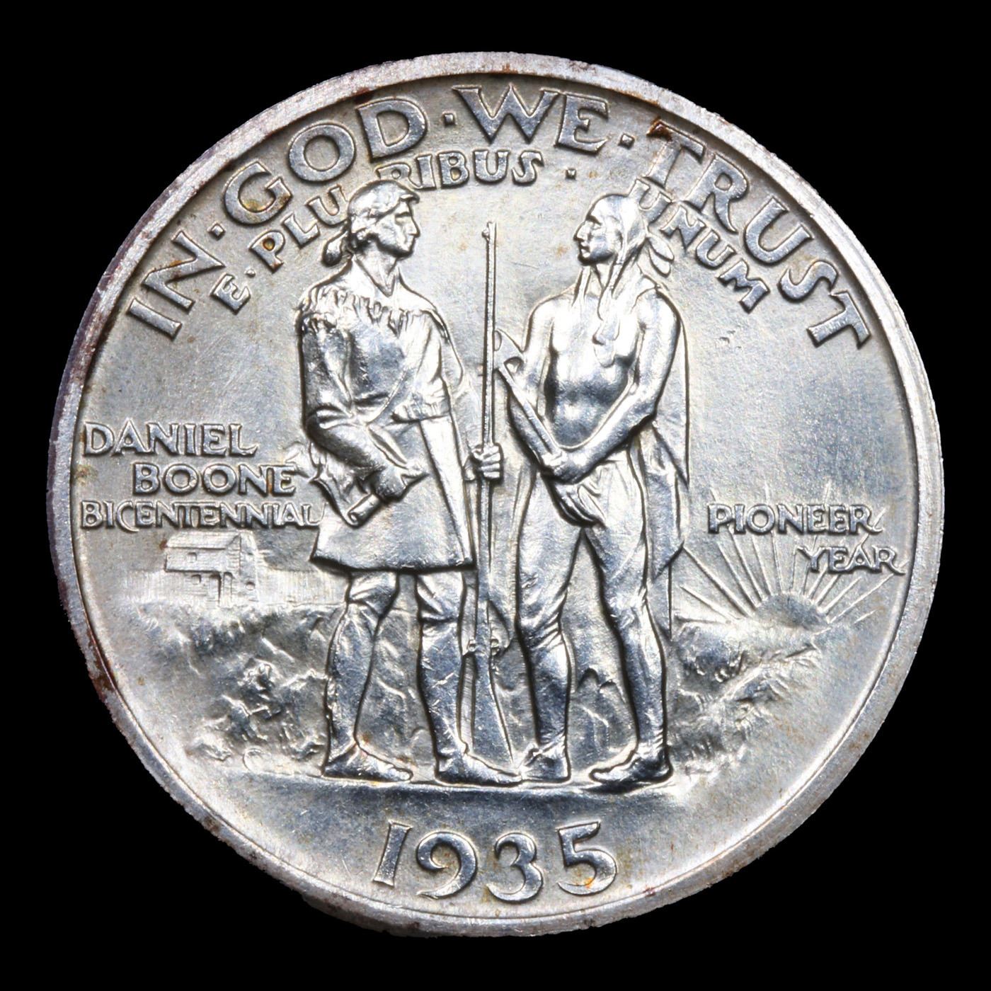 1935-p Boone Old Commem Half Dollar 50c Grades GEM+ Unc. The Daniel Boone Half Dollar was minted to celebrate the 200th anniversary of the birth of the famous frontiersman, explorer, and folk hero. Originally, the coins were struck at the Philadelphia Mint to coincide with the bicentennial year. During the next four years, the coins would continue to be struck, across three different mint facilities.On the obverse of the coin is a portrait of Daniel Boone. Since no known portraits of him exist, this is an artists conception created by Augustus Lukeman. The likeness looks decidedly different than the portrait of Boone, which had appeared on the previous 1921 Missouri Centennial Half Dollar. The reverse of the coin features a scene of the frontiersman holding a chart of Kentucky and a musket, facing an American Indian holding a tomahawk. In the background a blockhouse stockade and a sun with rays appear. This was also designed by Augustus Lukeman. Out of the maximum authorized mintage of 600,000 coins, there were only 10,007 of the 1934 Daniel Boone Half Dollars produced and sold at a price of $1.60 each. In the following year, additional coins were struck at the Philadelphia, Denver, and San Francisco Mints carrying the 1935 date. Subsequent to the initial distribution, legislation was passed in Congress stipulating that the original design should be supplemented by adding the bicentennial year “1934” to the reverse of the coin. A smaller number of coins were minted with the “small 1934 on reverse” and came to represent a scarce variety.More coins continued to be minted and issued in 1936, 1937, and 1938. The final two years would have smaller net distribution levels as collectors began to grow weary of the endless string of varieties of the commemorative coin, issued years after the actual bicentennial.