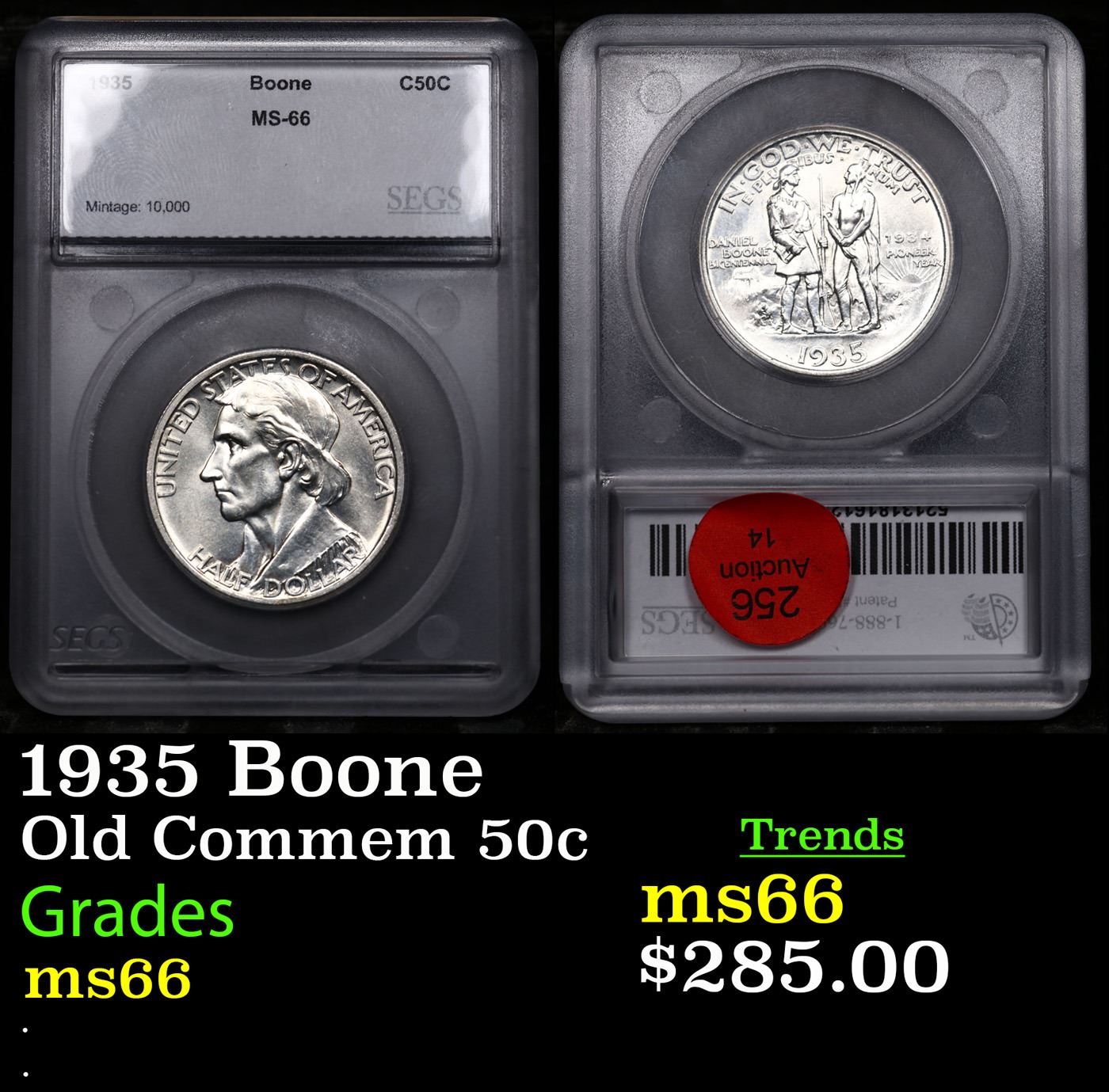 1935-p Boone Old Commem Half Dollar 50c Grades ms66 By SEGS. The Daniel Boone Half Dollar was minted to celebrate the 200th anniversary of the birth of the famous frontiersman, explorer, and folk hero. Originally, the coins were struck at the Philadelphia Mint to coincide with the bicentennial year. During the next four years, the coins would continue to be struck, across three different mint facilities.On the obverse of the coin is a portrait of Daniel Boone. Since no known portraits of him exist, this is an artists conception created by Augustus Lukeman. The likeness looks decidedly different than the portrait of Boone, which had appeared on the previous 1921 Missouri Centennial Half Dollar. The reverse of the coin features a scene of the frontiersman holding a chart of Kentucky and a musket, facing an American Indian holding a tomahawk. In the background a blockhouse stockade and a sun with rays appear. This was also designed by Augustus Lukeman. Out of the maximum authorized mintage of 600,000 coins, there were only 10,007 of the 1934 Daniel Boone Half Dollars produced and sold at a price of $1.60 each. In the following year, additional coins were struck at the Philadelphia, Denver, and San Francisco Mints carrying the 1935 date. Subsequent to the initial distribution, legislation was passed in Congress stipulating that the original design should be supplemented by adding the bicentennial year “1934” to the reverse of the coin. A smaller number of coins were minted with the “small 1934 on reverse” and came to represent a scarce variety.More coins continued to be minted and issued in 1936, 1937, and 1938. The final two years would have smaller net distribution levels as collectors began to grow weary of the endless string of varieties of the commemorative coin, issued years after the actual bicentennial.