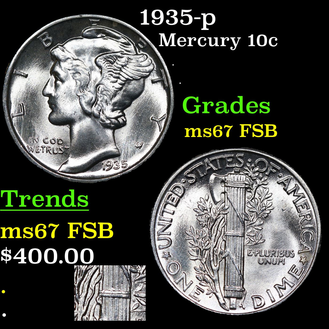 1935-p Mercury Dime 10c Grades GEM++ FSB.