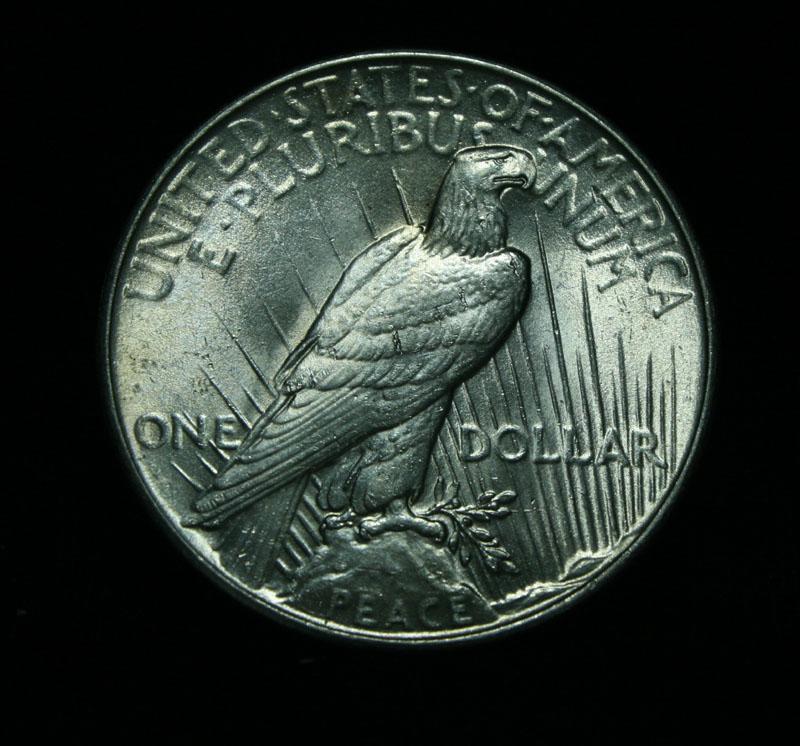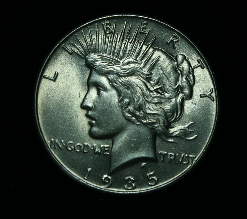 A great and pleasing example of the 1935-p. Very superior luster. Great Eye appeal. Final Year of issue of the Peace Dollar Series and the last time a 90% silver Dollar was released for general circulation in American history. Wholesale Greysheet Value is $175 in ms64 and $600 in ms65. Estimated Value $250