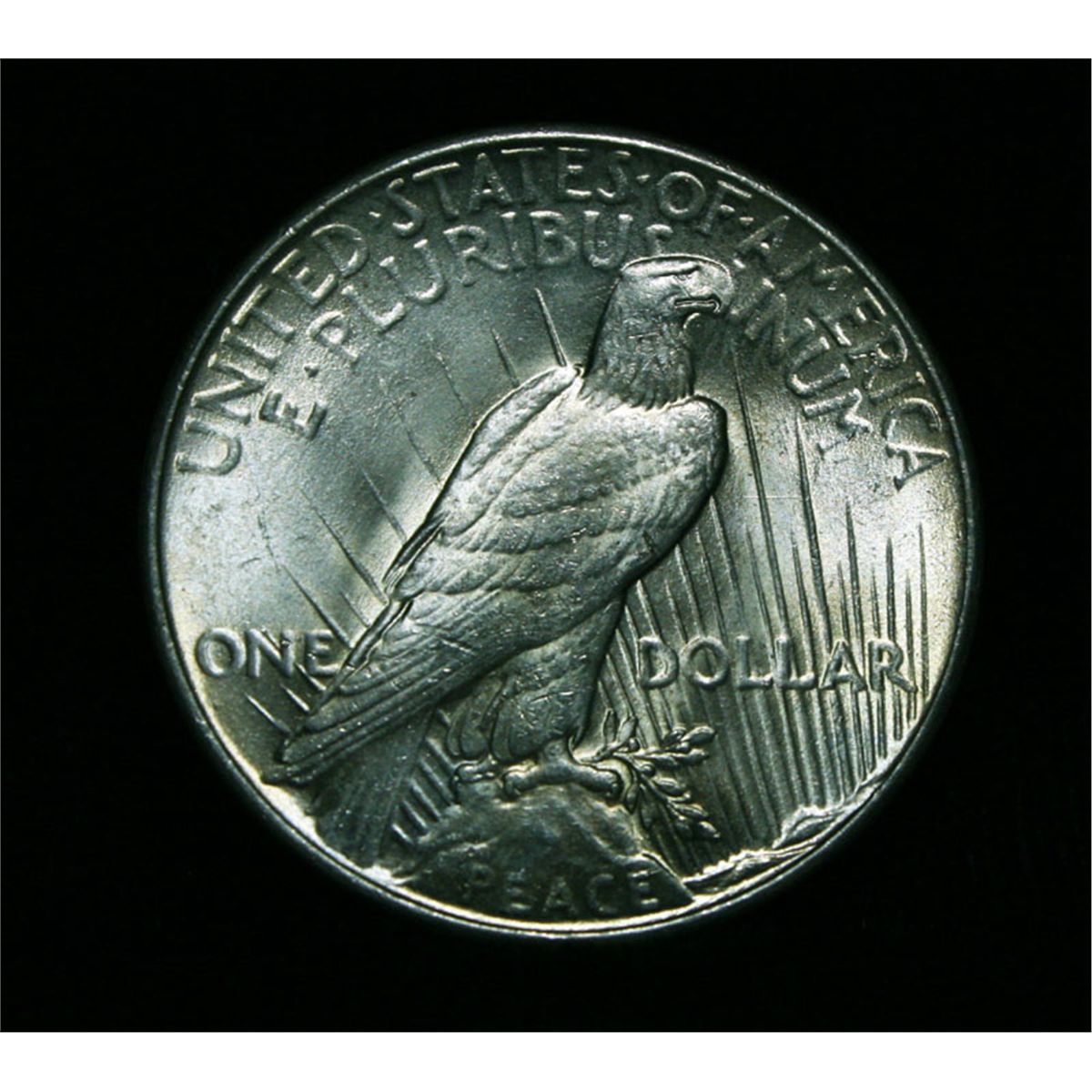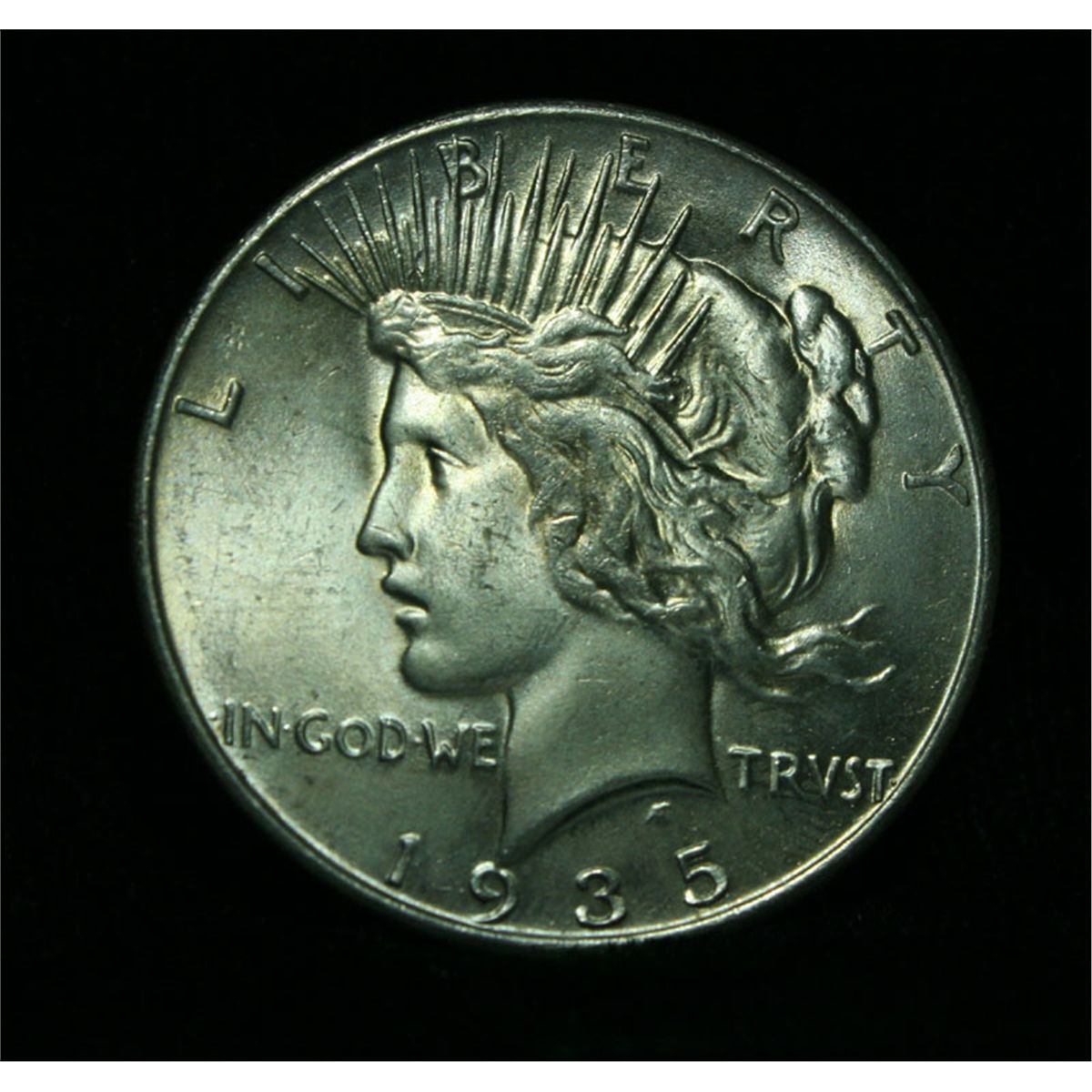 A great and pleasing example of the 1935-p. Light golden toning. Superior luster. Great Eye appeal. Final Year of issue of the Peace Dollar Series and the last time a 90% silver Dollar was released for general circulation in American history. Wholesale Greysheet Value is $175 in ms64 and $575 in ms65. Estimated Value $300