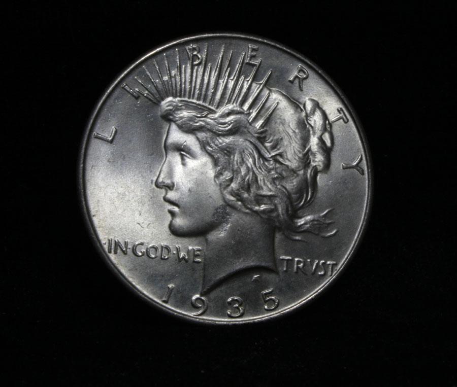 A great and pleasing example of the 1935-p. Very pretty. Nice Luster. Final Year of issue of the Peace Dollar Series and the last time a 90% silver Dollar was released for general circulation in American history. Wholesale Greysheet Value is $170 in ms64. Estimated Value $175