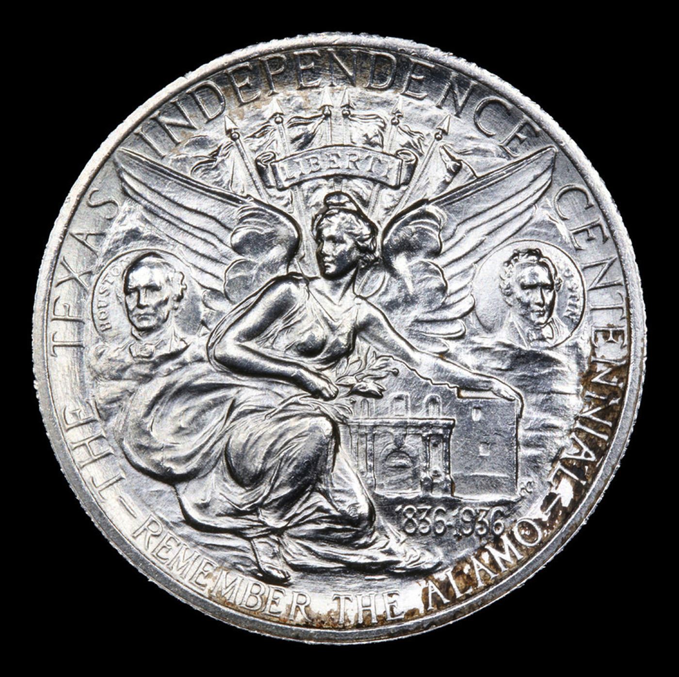 1935-p Texas Old Commem Half Dollar 50c Graded ms66+ BY SEGS. The Texas Centennial half dollar commemorative coin was minted to honor the Centennial of Texas's independence from Mexico. Early in the administration of President Franklin Delano Roosevelt, on June 15, 1933, Congress passed an act to authorize the coinage of silver half dollars "in commemoration of the one hundredth anniversary in 1936 of the independence of Texas, and of the noble and heroic sacrifices of her pioneers, whose revered memory has been an inspiration to her sons and daughters during the past century." The Texas commemorative series ran from 1934 thru 1938 and 13 different dates and mint mark combinations were issued. For each of the years 1935 thru 1938, coins were struck at all three Mints; Philadelphia, Denver, and San Francisco. But for the 1934 Texas, only Philadelphia Mint coins were issued. The original issue price was $1.00 per coin.The coin was designed by Pompeo Coppini, a Texan. The obverse depicts an Eagle sitting on a branch in front of the Lone Star, the symbol of Texas. The reverse depicts the goddess Victory spreading her wings over the Alamo. It also depicts Sam Houston on her left and Stephen F. Austin on her right. The Six Flags of Texas fly above her head. Under her it reads REMEMBER THE ALAMO. Over Sam Houston, Victory, and Stephen F. Austin it reads THE TEXAS INDEPENDENCE CENTENNIAL.