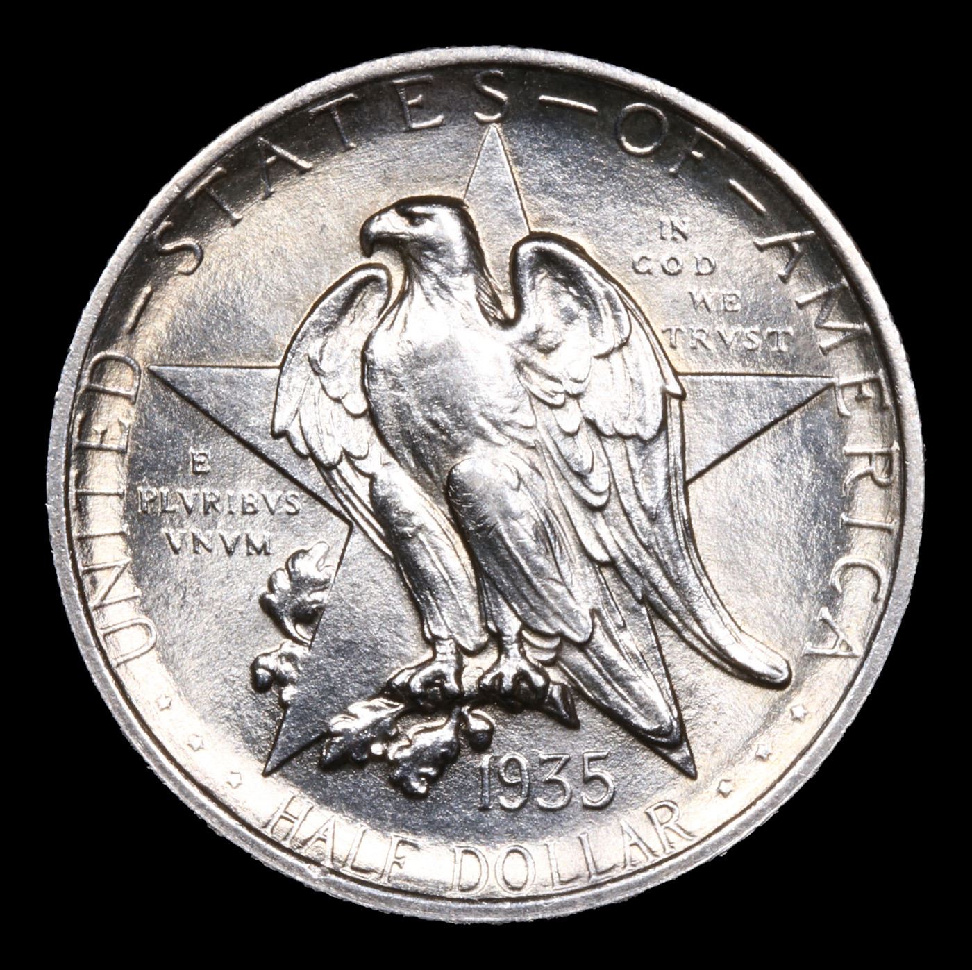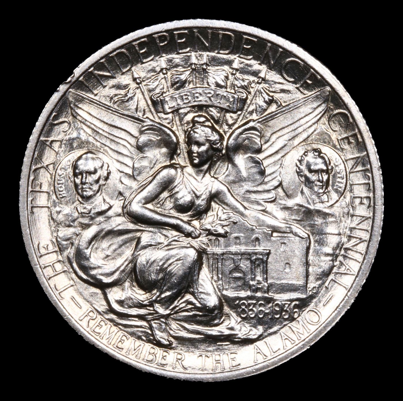 1935-p Texas Old Commem Half Dollar 50c Grades GEM+ Unc. The Texas Centennial half dollar commemorative coin was minted to honor the Centennial of Texas's independence from Mexico. Early in the administration of President Franklin Delano Roosevelt, on June 15, 1933, Congress passed an act to authorize the coinage of silver half dollars "in commemoration of the one hundredth anniversary in 1936 of the independence of Texas, and of the noble and heroic sacrifices of her pioneers, whose revered memory has been an inspiration to her sons and daughters during the past century." The Texas commemorative series ran from 1934 thru 1938 and 13 different dates and mint mark combinations were issued. For each of the years 1935 thru 1938, coins were struck at all three Mints; Philadelphia, Denver, and San Francisco. But for the 1934 Texas, only Philadelphia Mint coins were issued. The original issue price was $1.00 per coin.The coin was designed by Pompeo Coppini, a Texan. The obverse depicts an Eagle sitting on a branch in front of the Lone Star, the symbol of Texas. The reverse depicts the goddess Victory spreading her wings over the Alamo. It also depicts Sam Houston on her left and Stephen F. Austin on her right. The Six Flags of Texas fly above her head. Under her it reads REMEMBER THE ALAMO. Over Sam Houston, Victory, and Stephen F. Austin it reads THE TEXAS INDEPENDENCE CENTENNIAL.
