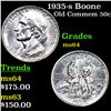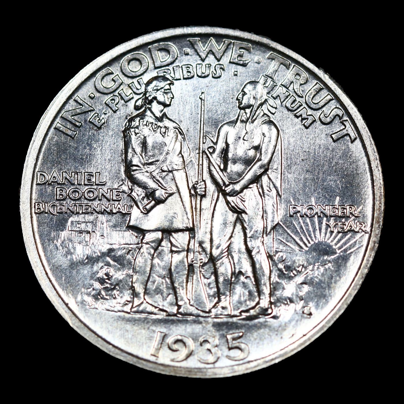 1935-s Boone Old Commem Half Dollar 50c Grades Choice Unc. The Daniel Boone Half Dollar was minted to celebrate the 200th anniversary of the birth of the famous frontiersman, explorer, and folk hero. Originally, the coins were struck at the Philadelphia Mint to coincide with the bicentennial year. During the next four years, the coins would continue to be struck, across three different mint facilities.On the obverse of the coin is a portrait of Daniel Boone. Since no known portraits of him exist, this is an artists conception created by Augustus Lukeman. The likeness looks decidedly different than the portrait of Boone, which had appeared on the previous 1921 Missouri Centennial Half Dollar. The reverse of the coin features a scene of the frontiersman holding a chart of Kentucky and a musket, facing an American Indian holding a tomahawk. In the background a blockhouse stockade and a sun with rays appear. This was also designed by Augustus Lukeman. Out of the maximum authorized mintage of 600,000 coins, there were only 10,007 of the 1934 Daniel Boone Half Dollars produced and sold at a price of $1.60 each. In the following year, additional coins were struck at the Philadelphia, Denver, and San Francisco Mints carrying the 1935 date. Subsequent to the initial distribution, legislation was passed in Congress stipulating that the original design should be supplemented by adding the bicentennial year “1934” to the reverse of the coin. A smaller number of coins were minted with the “small 1934 on reverse” and came to represent a scarce variety.More coins continued to be minted and issued in 1936, 1937, and 1938. The final two years would have smaller net distribution levels as collectors began to grow weary of the endless string of varieties of the commemorative coin, issued years after the actual bicentennial.