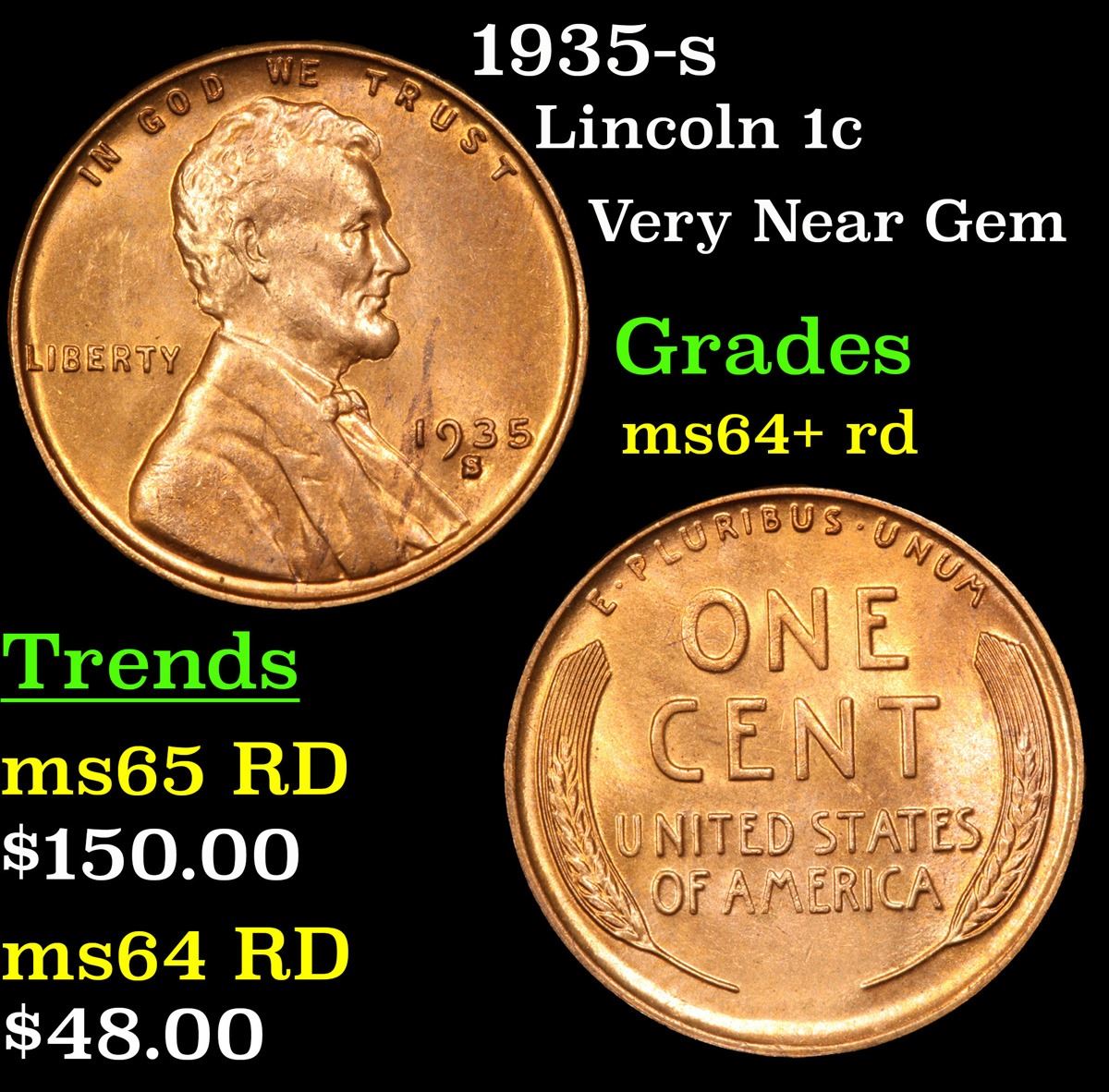 1935-s . Very Near Gem Lincoln Cent 1c Grades Choice+ Unc RD.