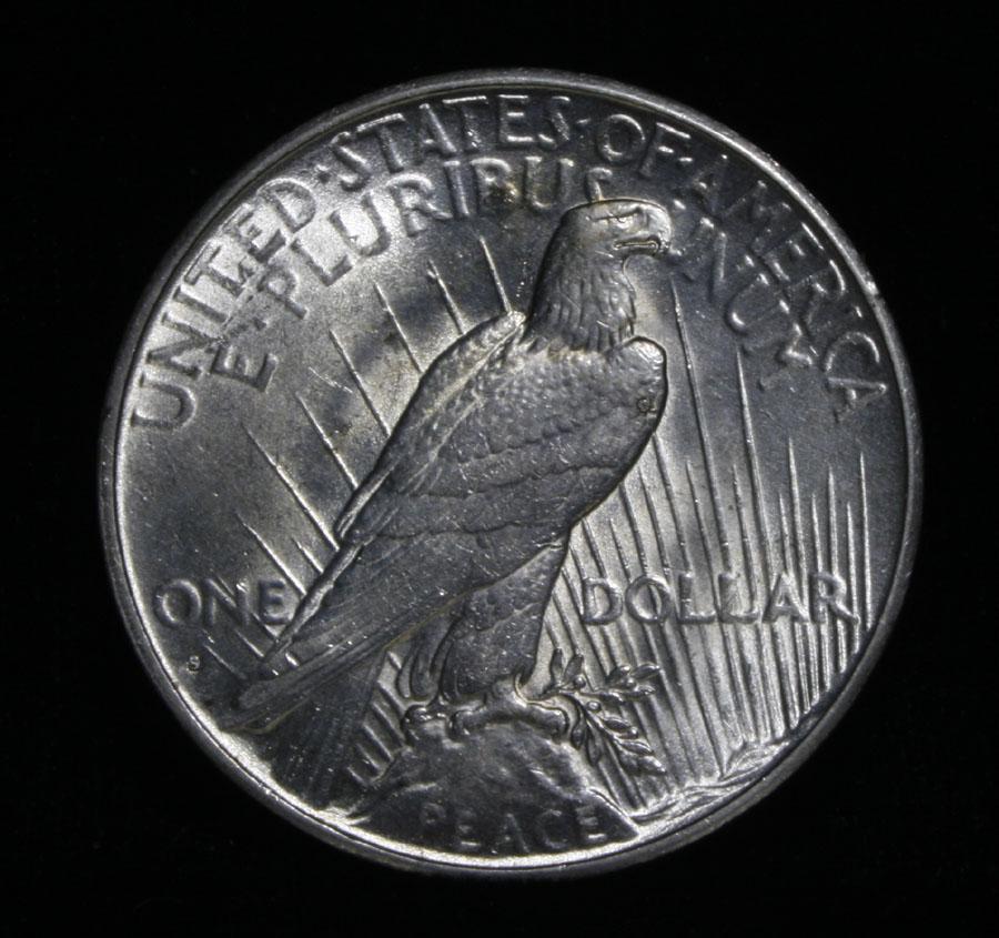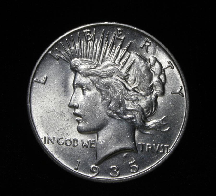 A wild Die Crack with a displaced field highlight this Great Lustrous and well struck 1935-s Peace Dollar, Final Year of Issue. Coin World's Coin Values lists ms64 as $575 and The Wholesale Greysheet lists ms64 at $450. Estimated Value $475