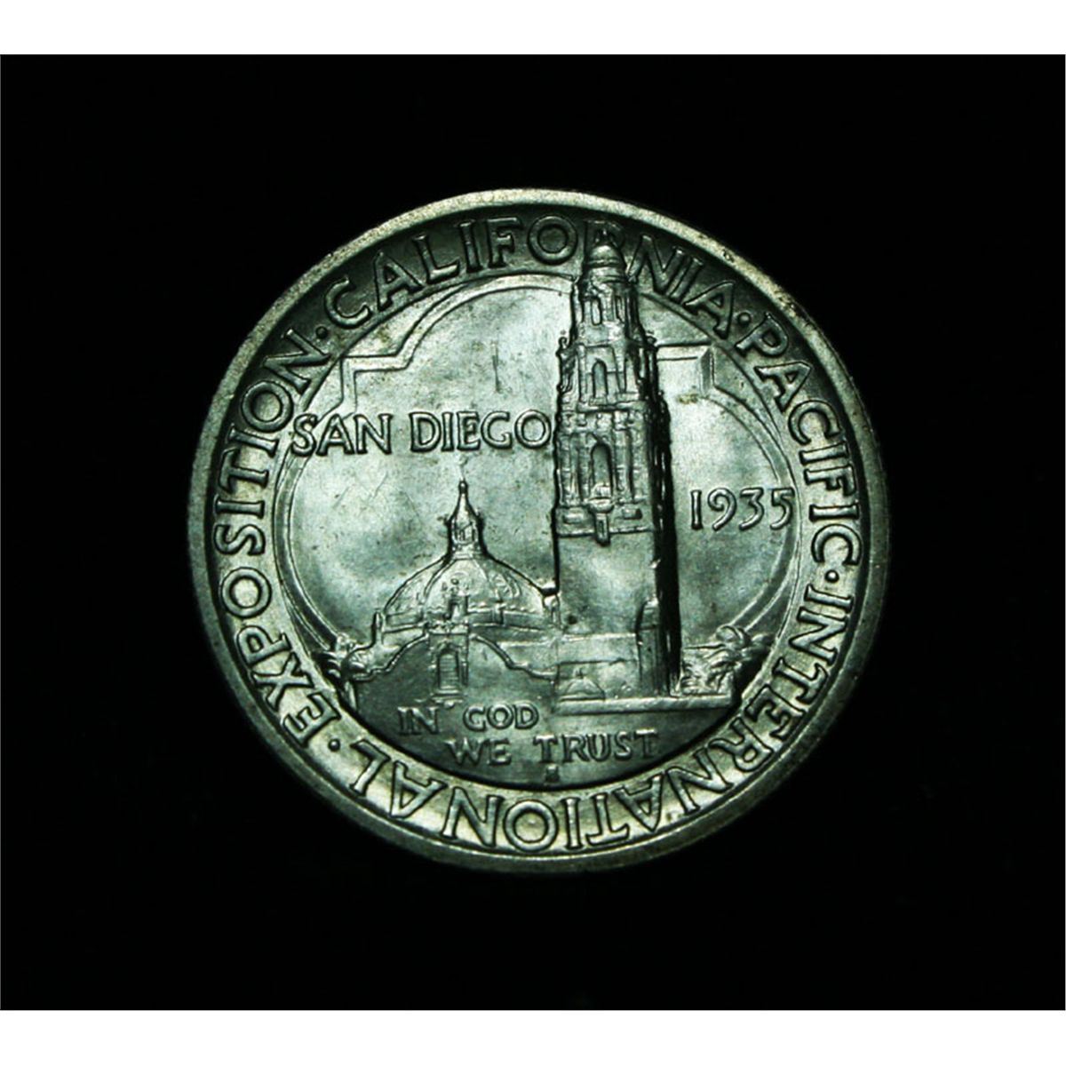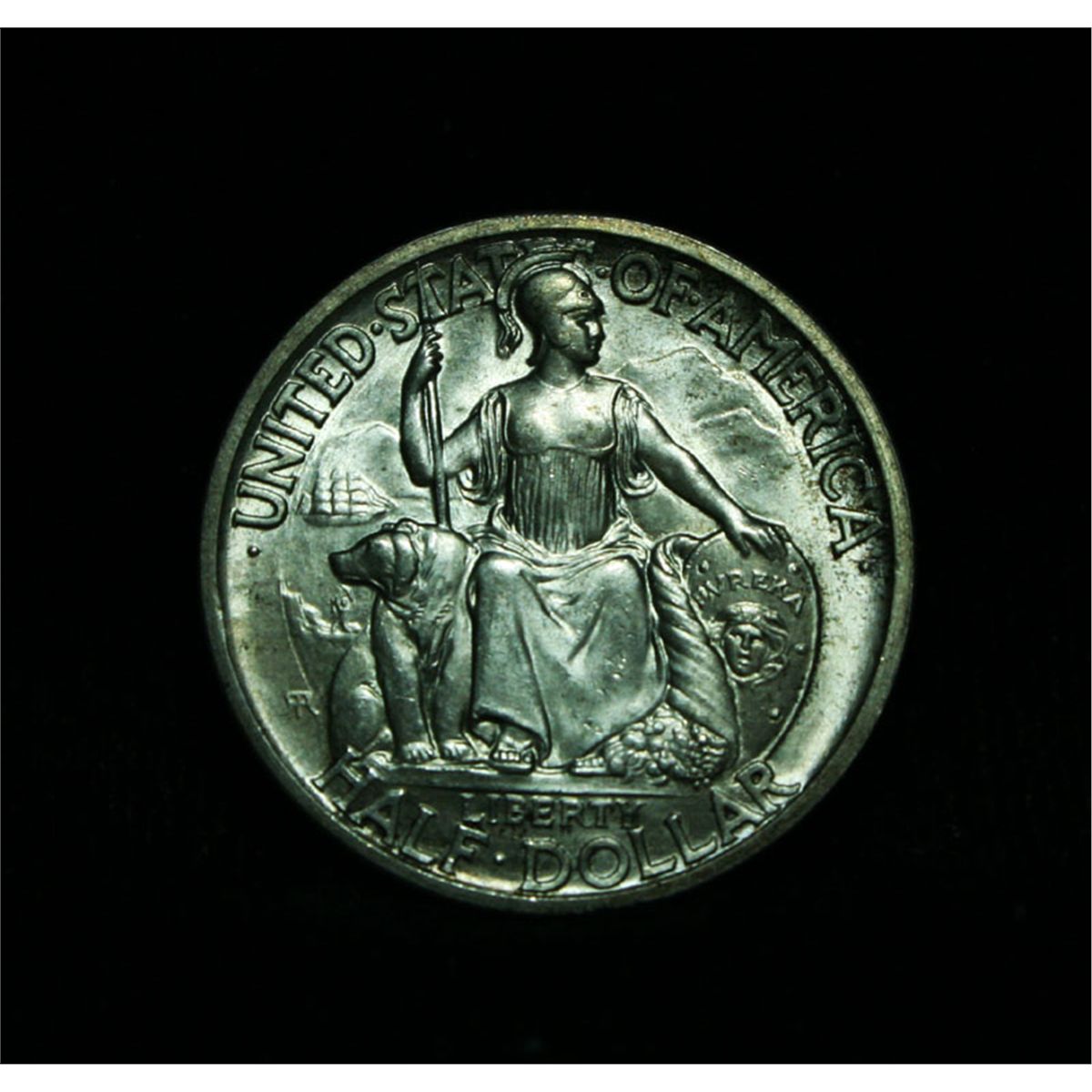 Great looking coin, with super luster. It was consigned as an ms63, but when examining Minerva's knees under 16x loupe I think its a faint bit of wear. So I'm calling it a slider. When looking at a San Diego half look for the first signs of wear on Minerva’s knees and on the upper-right portion of the tower. NGC's Price Guide lists an au58 at $93 and The Wholesale Greysheet lists au50 at $75 and ms60 at $78. Estimated Value $80
