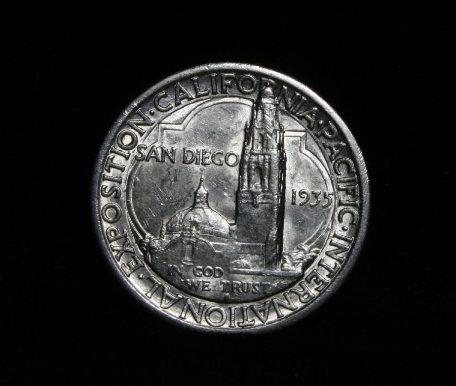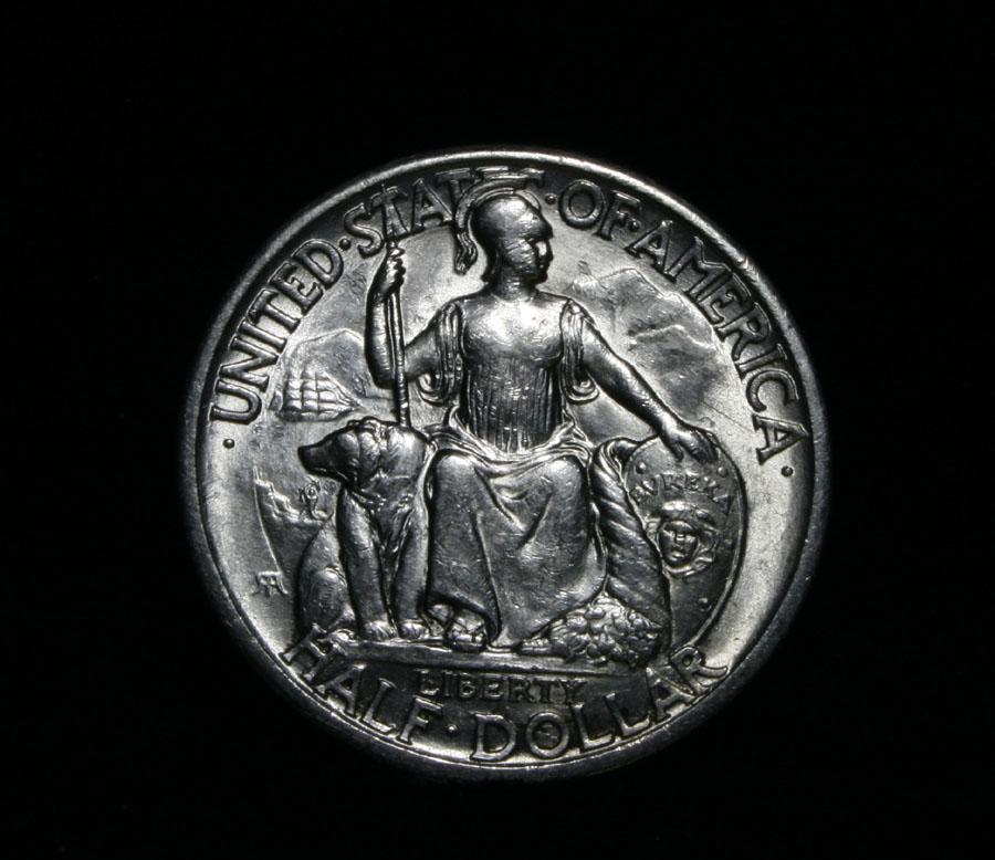 A nice white example of this San Diego Commemorative. When looking at a San Diego half look for the first signs of wear on Minerva’s knees and on the upper-right portion of the tower. Estimated Value $100