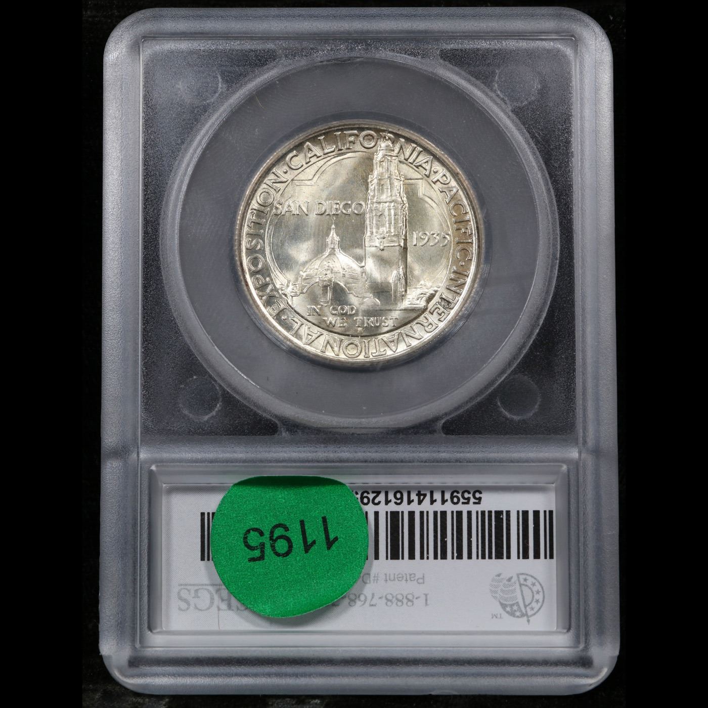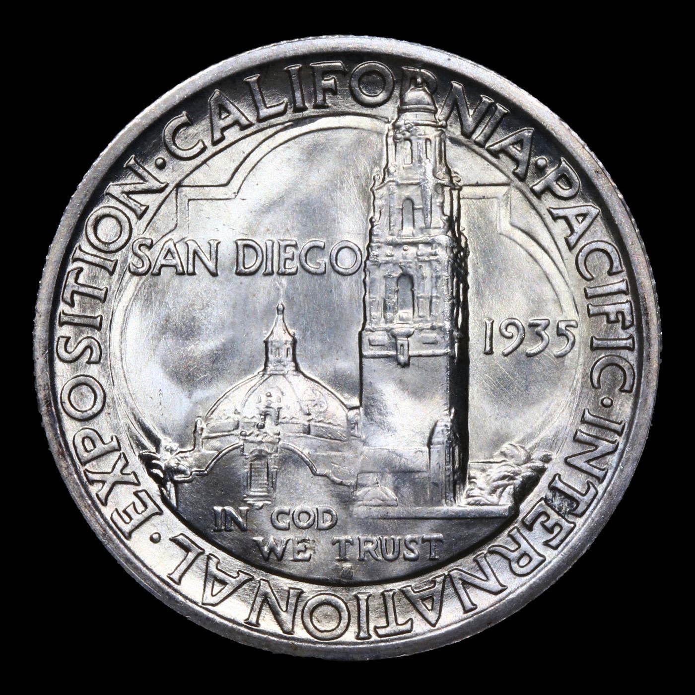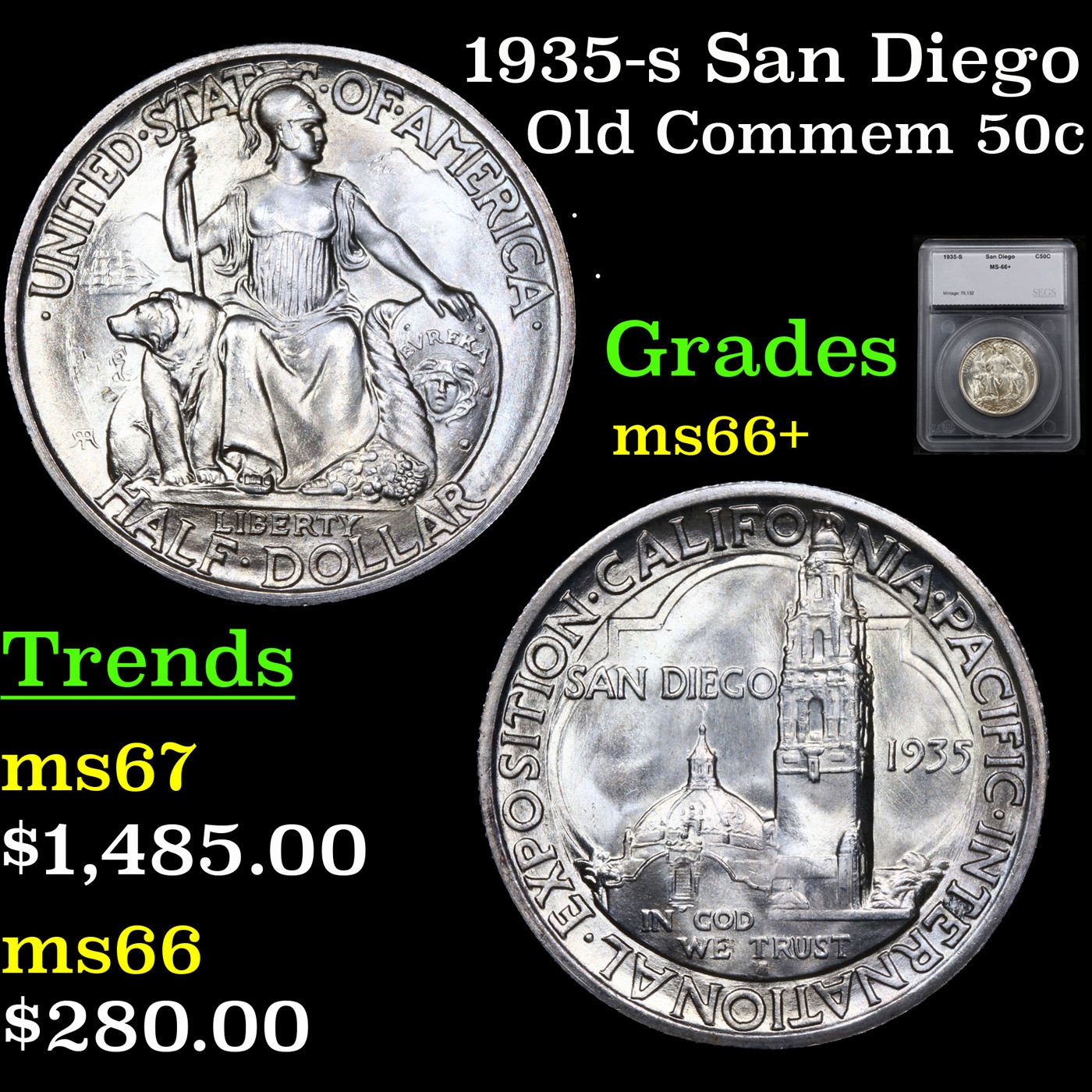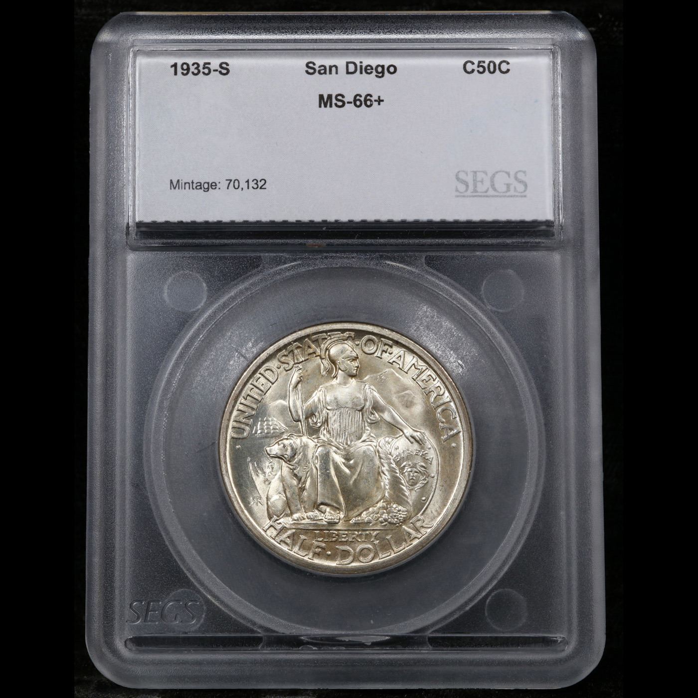 1935-s San Diego Old Commem Half Dollar 50c Graded ms66+ By SEGS. The issue commonly referred to as the San Diego Half Dollar was authorized to mark the California-Pacific International Exposition. The commemorative coins were first issued in 1935 struck at the San Francisco Mint, and later in 1936 struck at the Denver Mint.The obverse design was based on elements of the California State Seal. Minerva is seated with a spear and shield bearing the word “Eureka”, a grizzly bear is to her left, a horn of plenty is to the right, and a ship and miner at work appear in the background. The reverse image includes two of the exposition buildings, the observation tower and the Sate of California building. The designer of the coin was Robert Aitken, best known for his design of the 1915-S Panama Pacific $50 Gold Piece.The full maximum authorized mintage of 250,000 pieces was struck at the San Francisco Mint in 1935 and sales began at the price of $1 each. After slow initial sales, the exposition sought and received Congressional approval to send back 180,000 of the unsold coins to be melted and reminted with the 1936 date. The 1936-dated coins would be struck at the Denver Mint and offered for sale at $1.50 each. Meanwhile, a remaining quantity of the 1935-dated coins were offered at $3 each. Later, the cost of the 1936 coins were also raised to $3 each.Despite these efforts, sales progressed even more slowly. Eventually, 150,000 of the 1936 coins were sent back to the Mint for melting. After the entire convoluted process, total sales were 100,224 out of the 250,000 maximum authorized mintage.