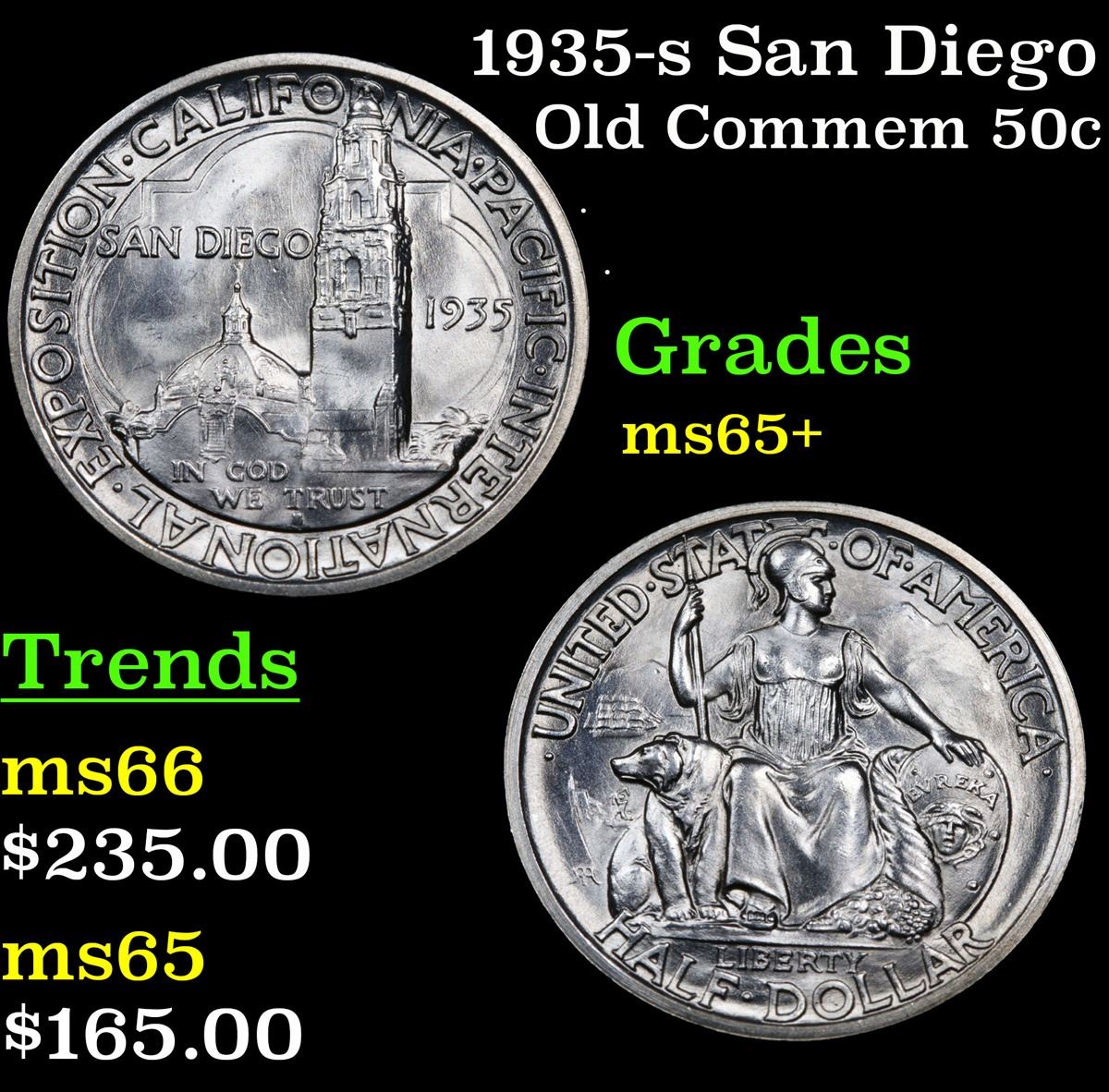 1935-s San Diego Old Commem Half Dollar 50c Grades GEM+ Unc. When looking at a San Diego half look for the first signs of wear on Minerva’s knees and on the upper-right portion of the tower.