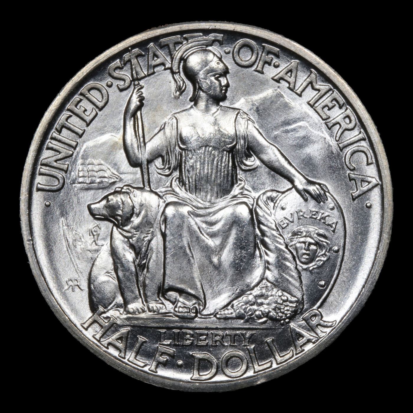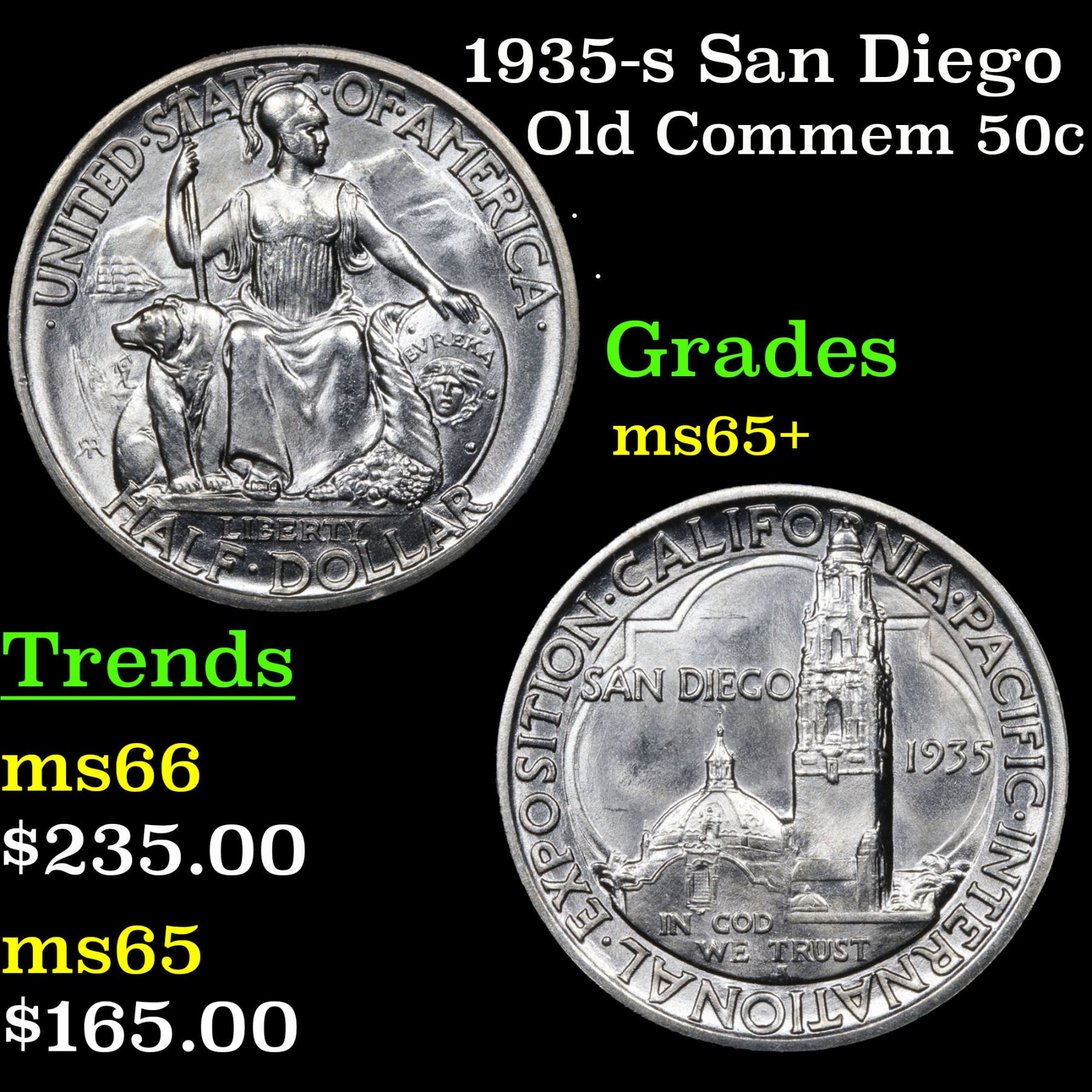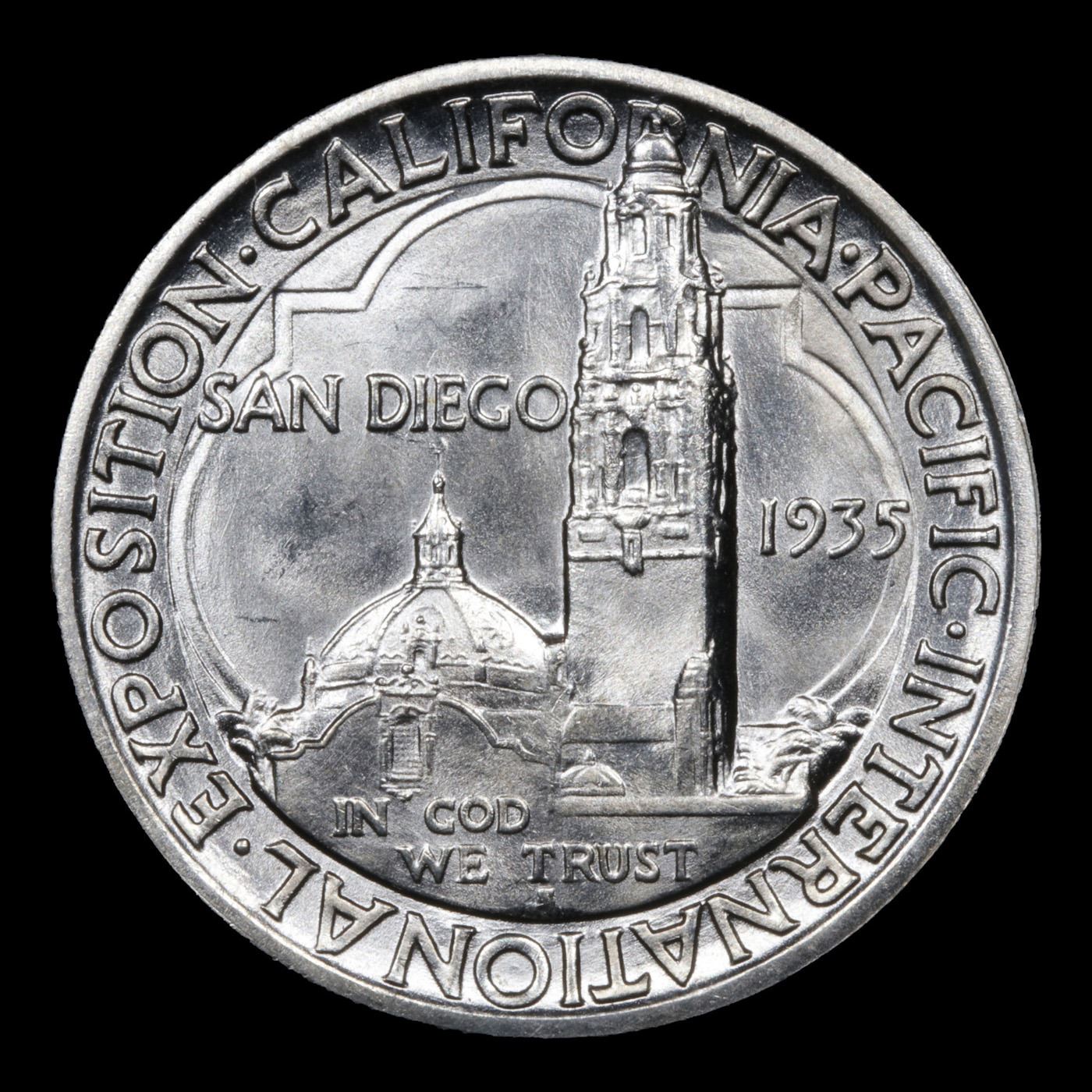 1935-s San Diego Old Commem Half Dollar 50c Grades GEM+ Unc. When looking at a San Diego half look for the first signs of wear on Minerva’s knees and on the upper-right portion of the tower.