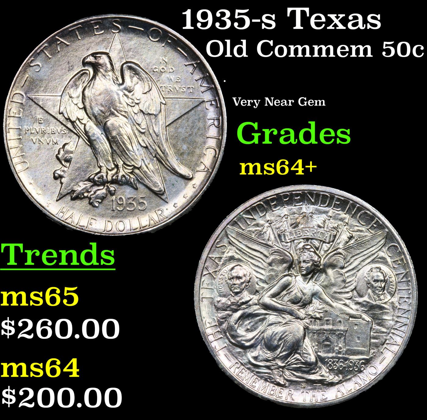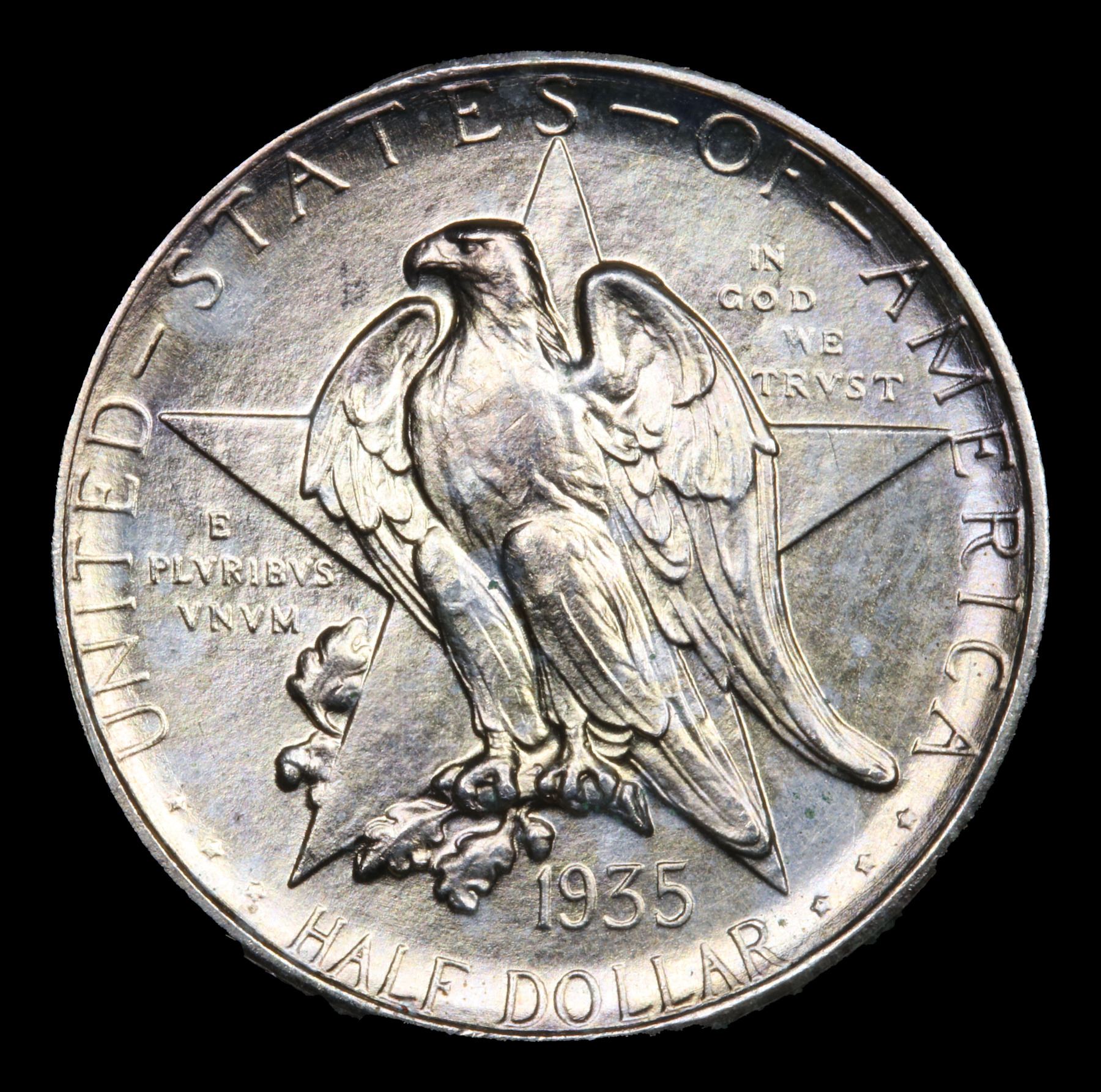 1935-s Texas Old Commem Half Dollar 50c Grades Choice+ Unc. The Texas Centennial half dollar commemorative coin was minted to honor the Centennial of Texas's independence from Mexico. Early in the administration of President Franklin Delano Roosevelt, on June 15, 1933, Congress passed an act to authorize the coinage of silver half dollars "in commemoration of the one hundredth anniversary in 1936 of the independence of Texas, and of the noble and heroic sacrifices of her pioneers, whose revered memory has been an inspiration to her sons and daughters during the past century." The Texas commemorative series ran from 1934 thru 1938 and 13 different dates and mint mark combinations were issued. For each of the years 1935 thru 1938, coins were struck at all three Mints; Philadelphia, Denver, and San Francisco. But for the 1934 Texas, only Philadelphia Mint coins were issued. The original issue price was $1.00 per coin.The coin was designed by Pompeo Coppini, a Texan. The obverse depicts an Eagle sitting on a branch in front of the Lone Star, the symbol of Texas. The reverse depicts the goddess Victory spreading her wings over the Alamo. It also depicts Sam Houston on her left and Stephen F. Austin on her right. The Six Flags of Texas fly above her head. Under her it reads REMEMBER THE ALAMO. Over Sam Houston, Victory, and Stephen F. Austin it reads THE TEXAS INDEPENDENCE CENTENNIAL.