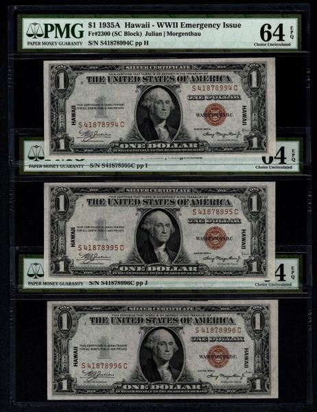 Lot of Three 1935A $1 Consecutive Hawaii Silver Certificates PMG 64EPQ.