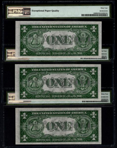 Lot of Three 1935A $1 Consecutive Hawaii Silver Certificates PMG 64EPQ.
