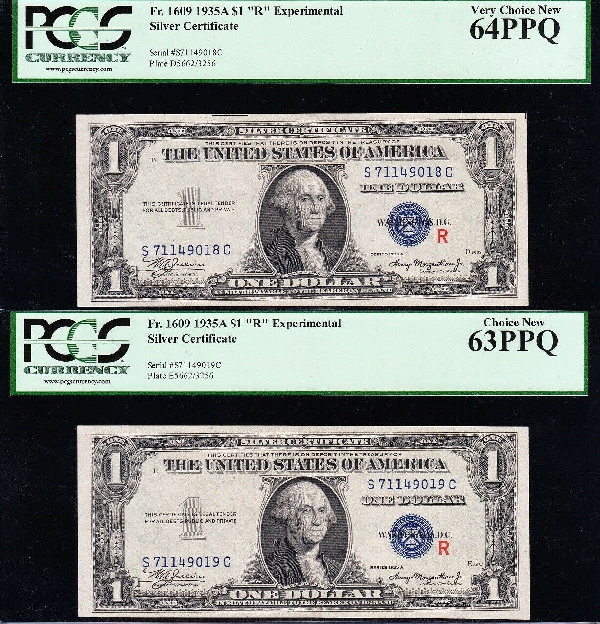 One 1935A $1 Consecutive R Experimental Silver Certificates PCGS.