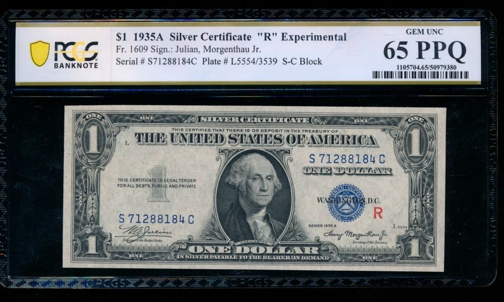 One 1935A $1 Experimental R Silver Certificate PCGS 65PPQ.