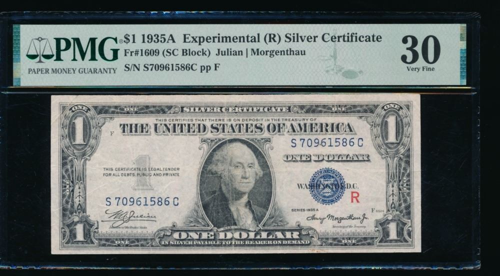 One 1935A $1 Experimental R Silver Certificate PMG 30.