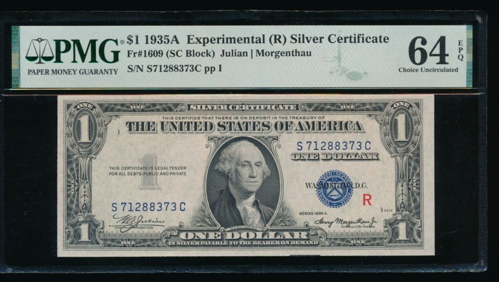 One 1935A $1 Experimental R Silver Certificate PMG 64EPQ.