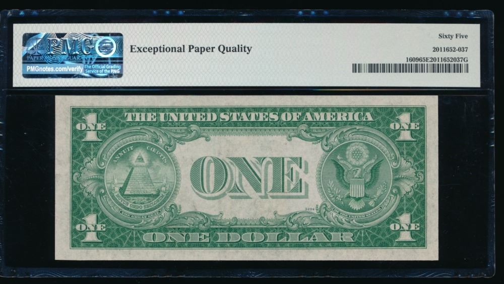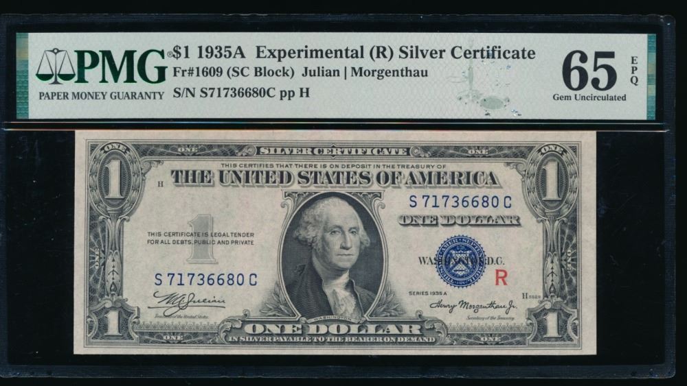 One 1935A $1 Experimental R Silver Certificate PMG 65EPQ.