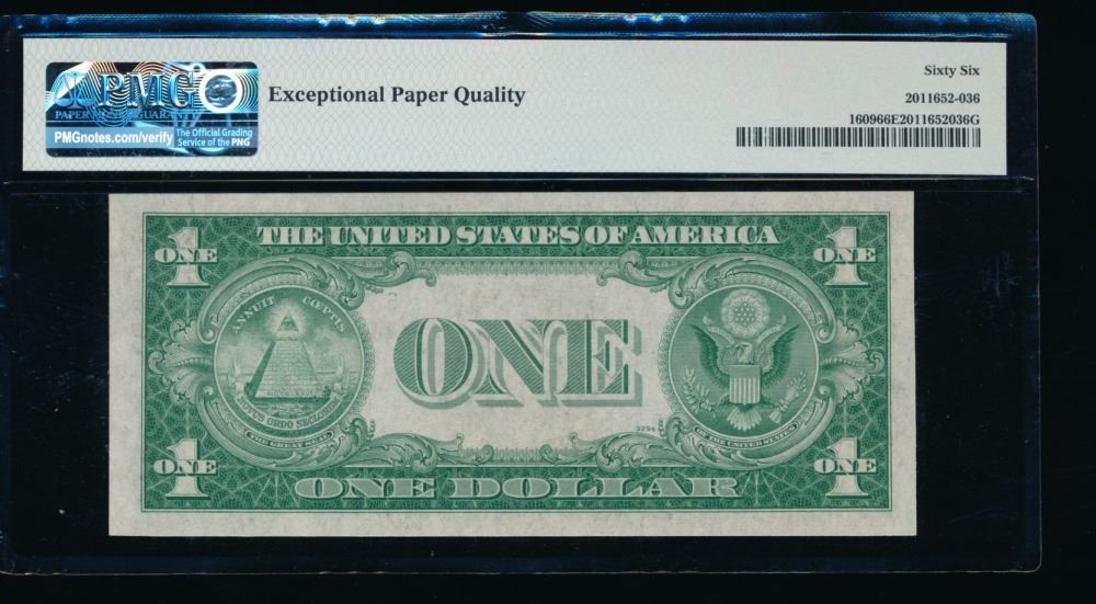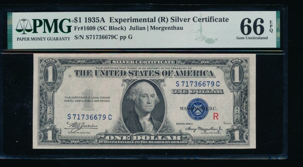 One 1935A $1 Experimental R Silver Certificate PMG 66EPQ.