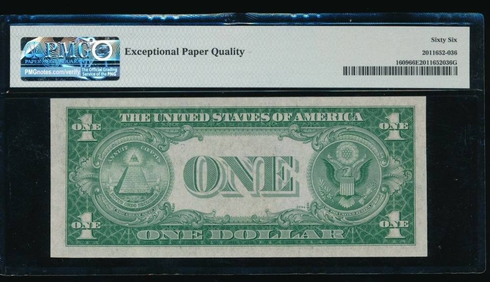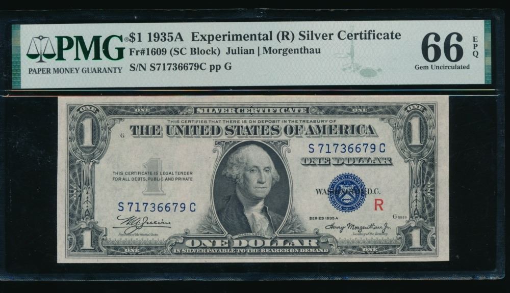 One 1935A $1 Experimental R Silver Certificate PMG 66EPQ.