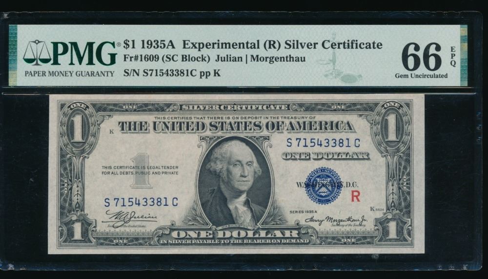 One 1935A $1 Experimental R Silver Certificate PMG 66EPQ.