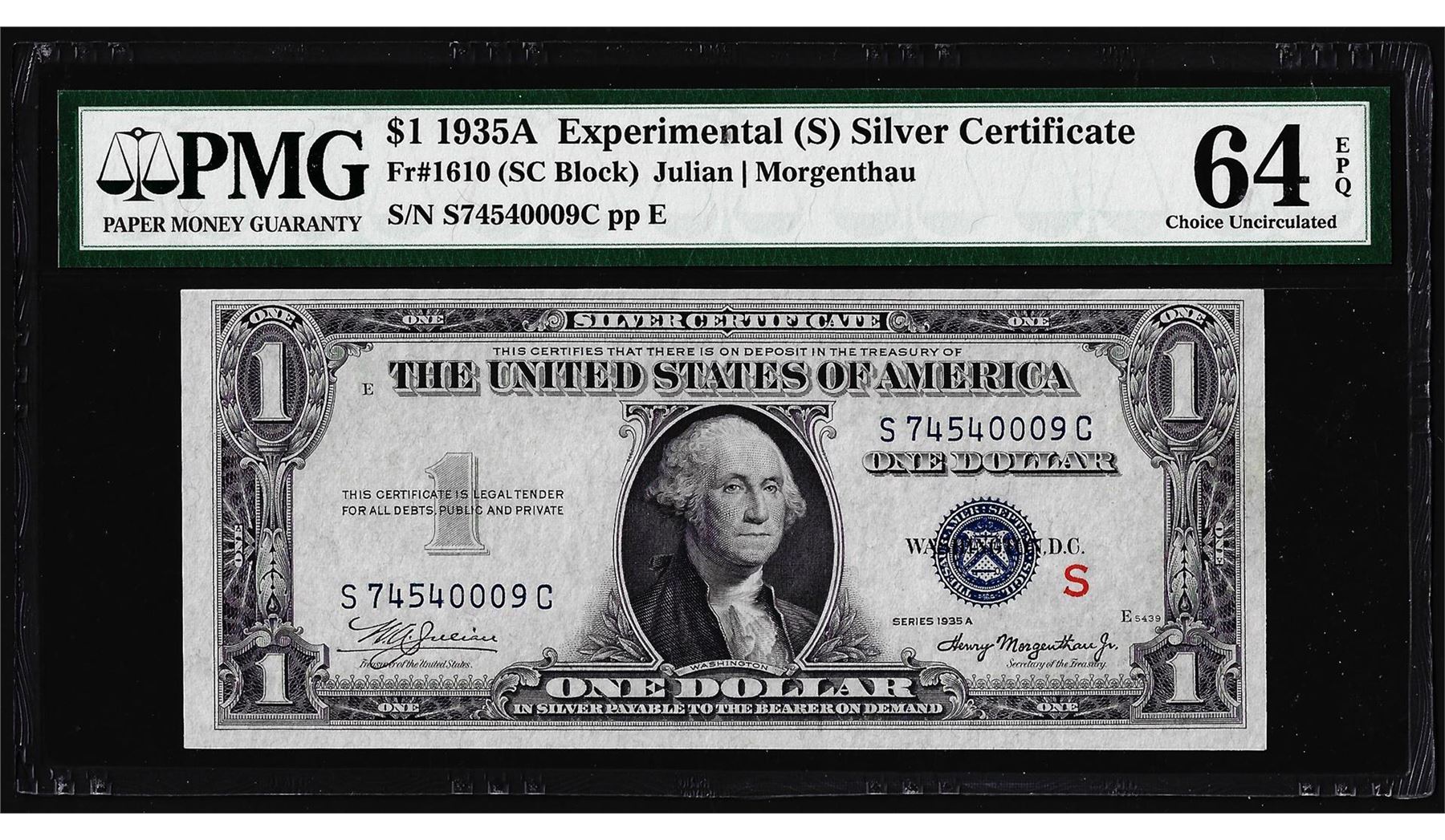 One 1935A $1 Experimental "S" Silver Certificate Note PMG Choice Uncirculated 64EPQ. PMG Certified.