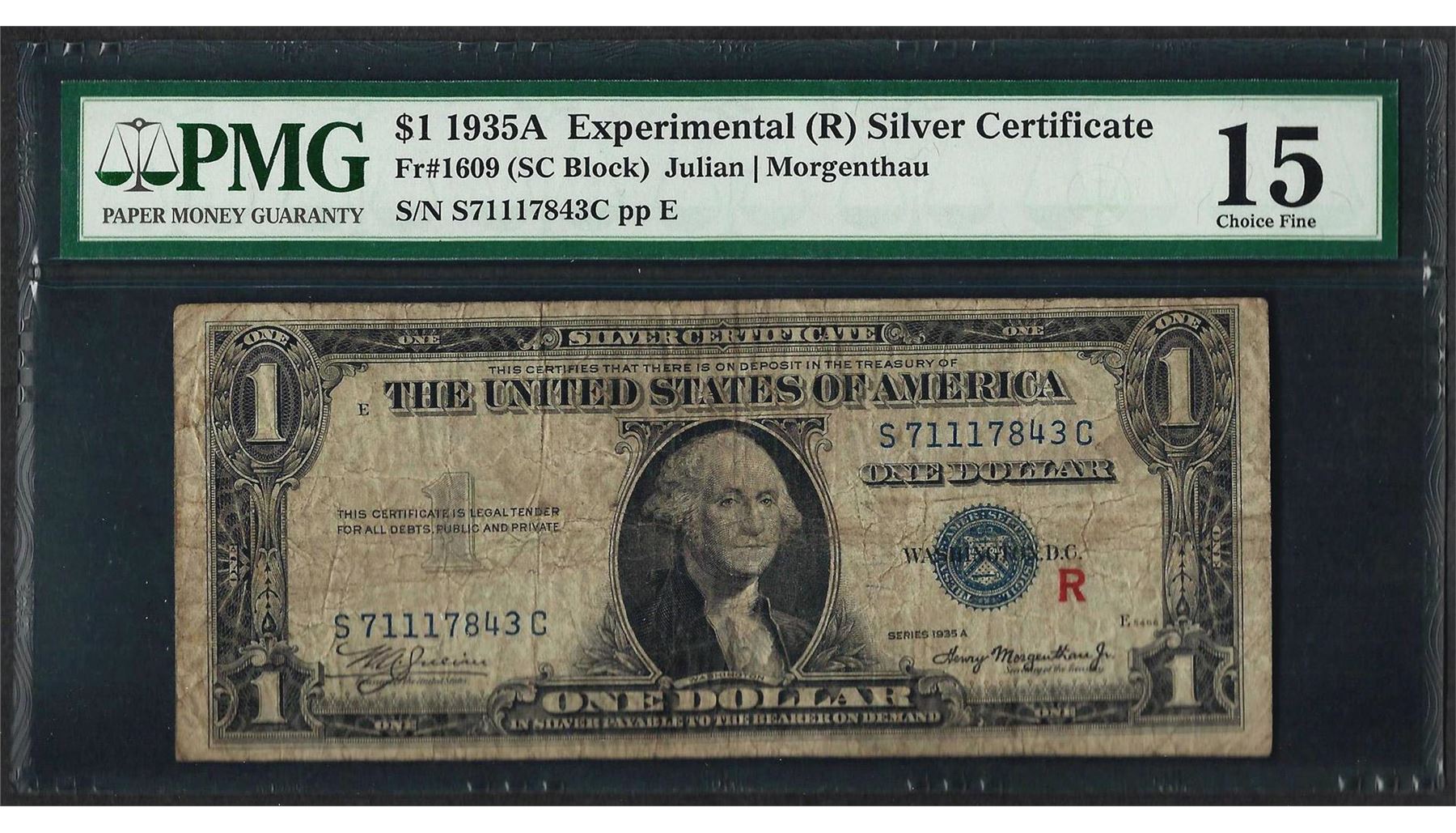 One 1935A $1 Experimental Silver Certificate Note Fr.1609 PMG Choice Fine 15. PMG Certified.