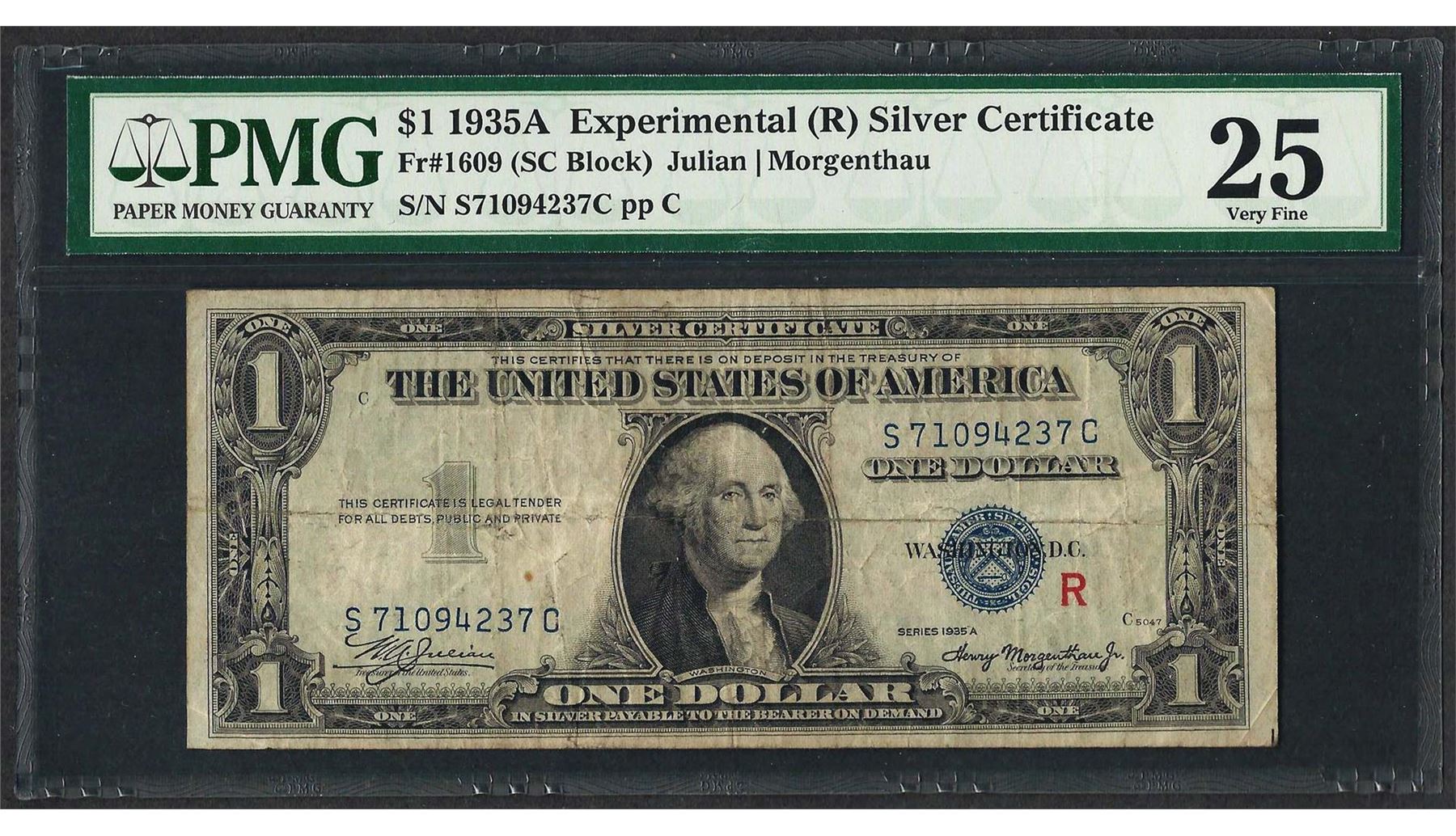 One 1935A $1 Experimental Silver Certificate Note Fr.1609 PMG Very Fine 25. PMG Certified.