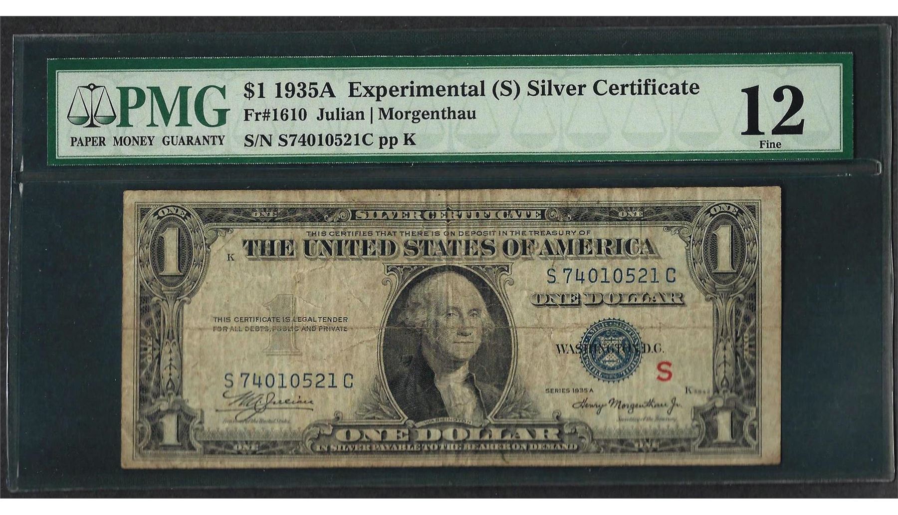 One 1935A $1 Experimental Silver Certificate Note Fr.1610 PMG Fine 12. PMG Appraised.