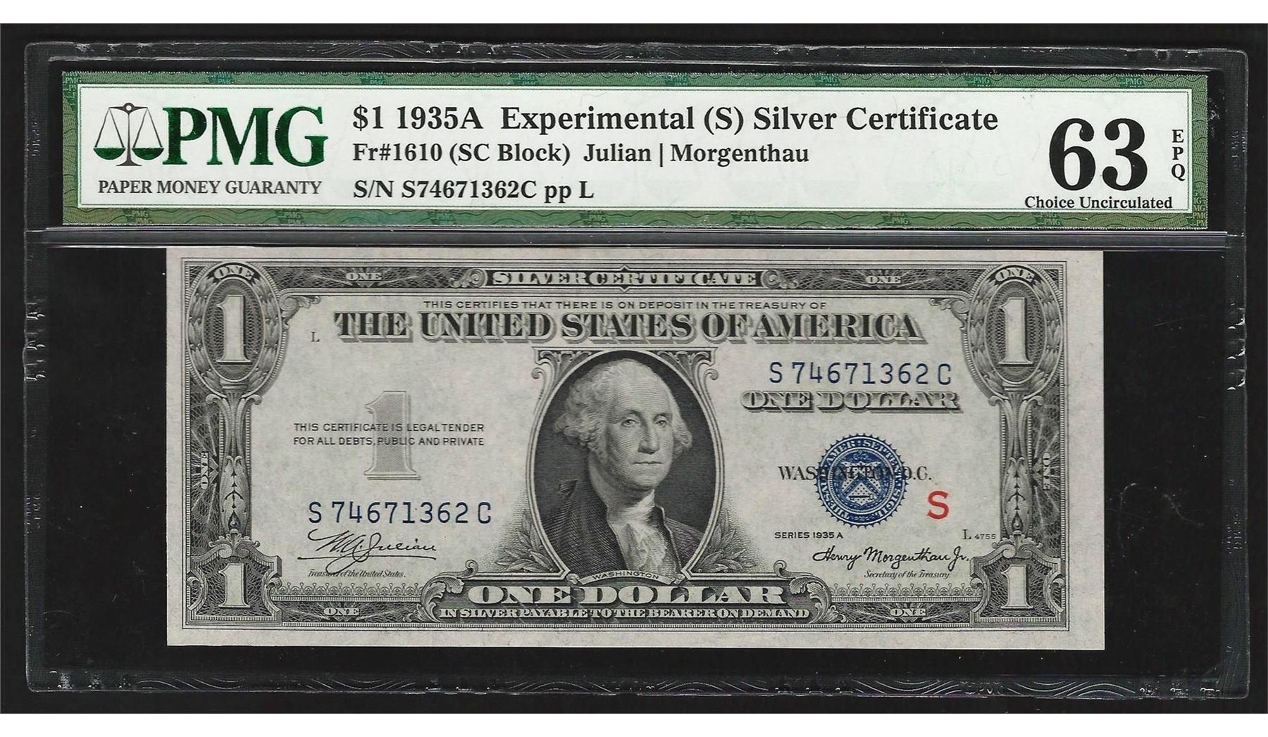 One 1935A $1 Experimental Silver Certificate Note PMG Choice Uncirculated 63EPQ. PMG Certified.
