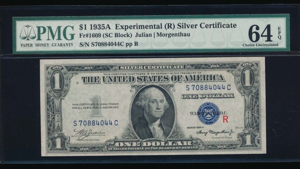One 1935A $1 Experimental Silver Certificate PMG 64EPQ.