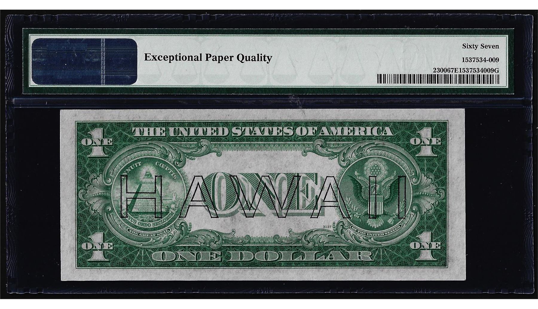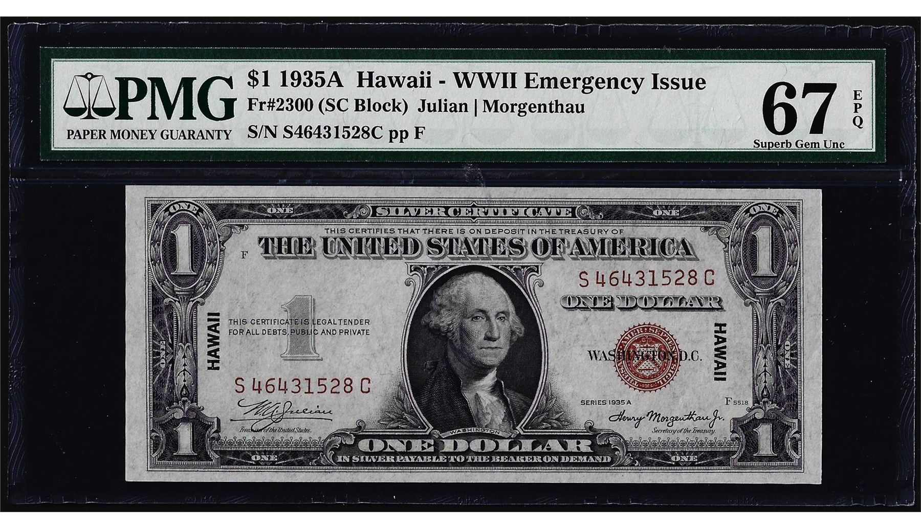 One 1935A $1 Hawaii Emergency Silver Certificate Note PMG Superb Gem Uncirculated 67EPQ. PMG Certified.