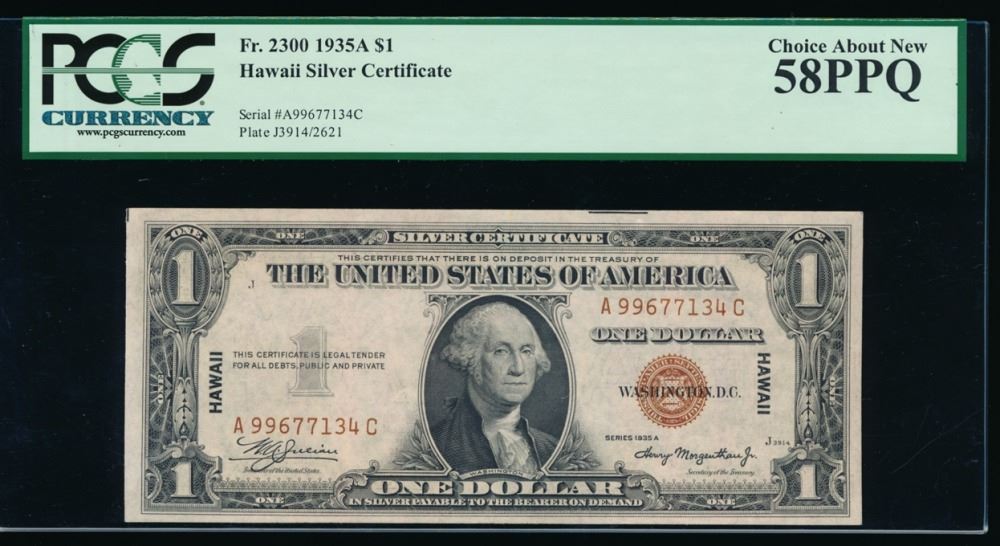 One 1935A $1 Hawaii Silver Certificate PCGS 58PPQ.