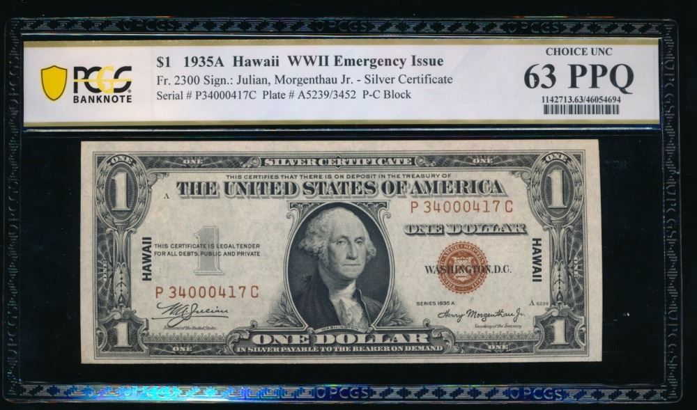 One 1935A $1 Hawaii Silver Certificate PCGS 63PPQ.