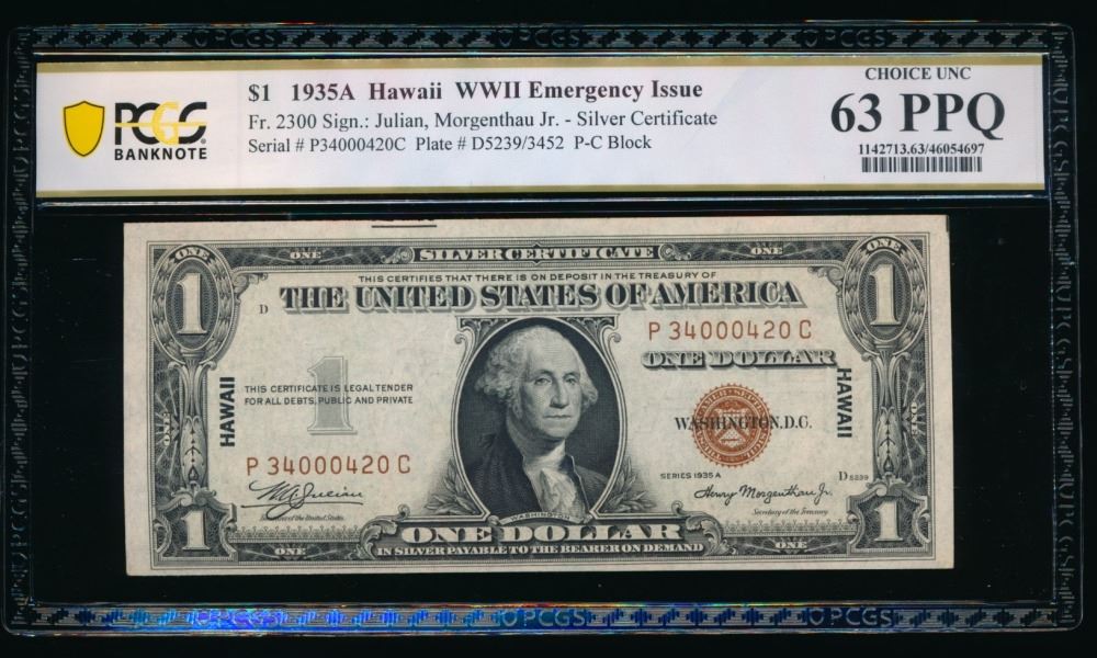 One 1935A $1 Hawaii Silver Certificate PCGS 63PPQ.