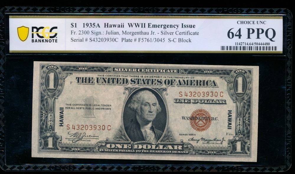 One 1935A $1 Hawaii Silver Certificate PCGS 64PPQ.