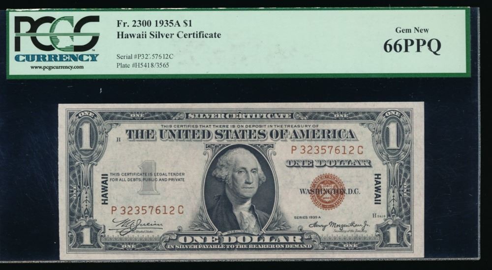One 1935A $1 Hawaii Silver Certificate PCGS 66PPQ.